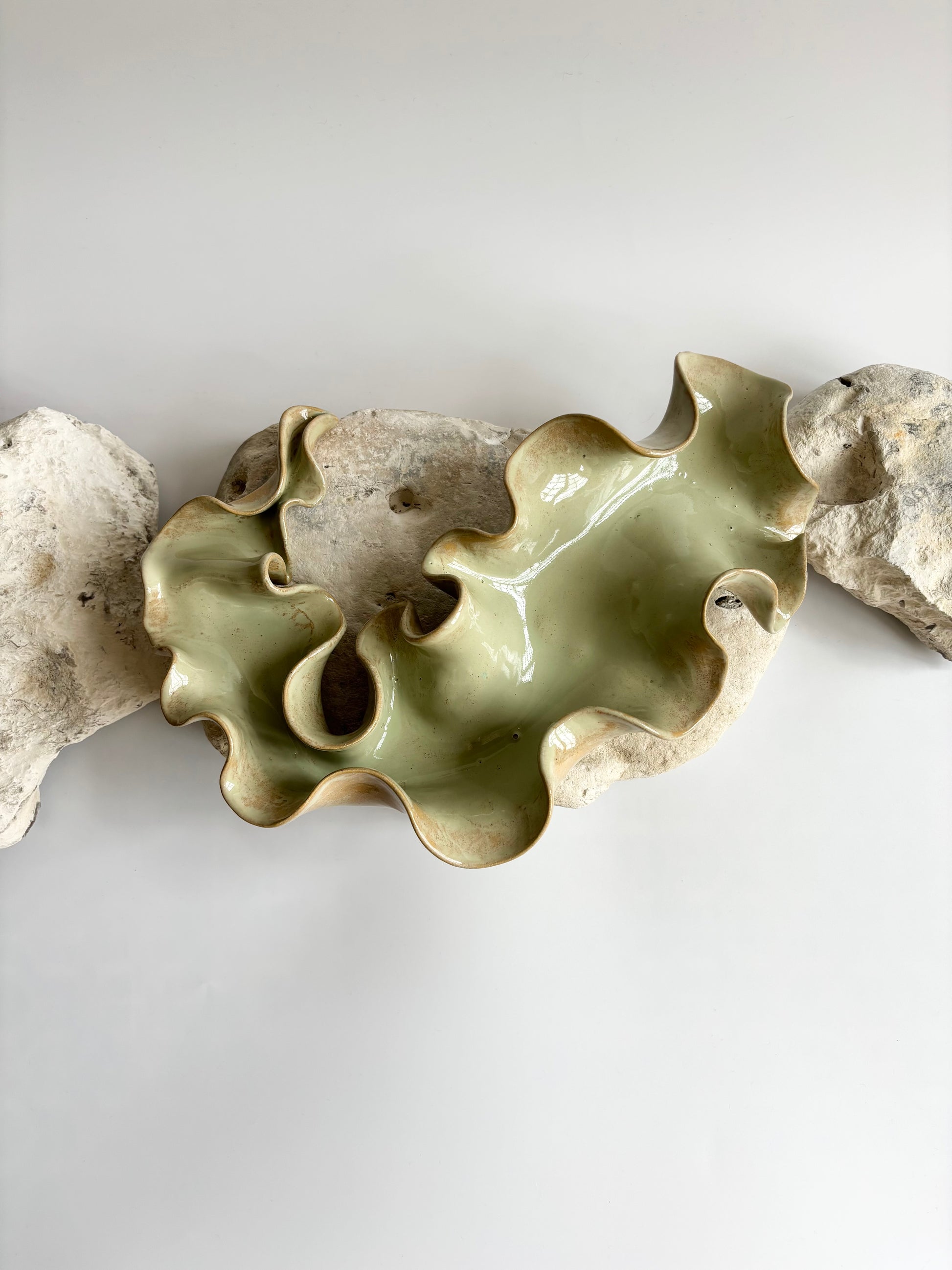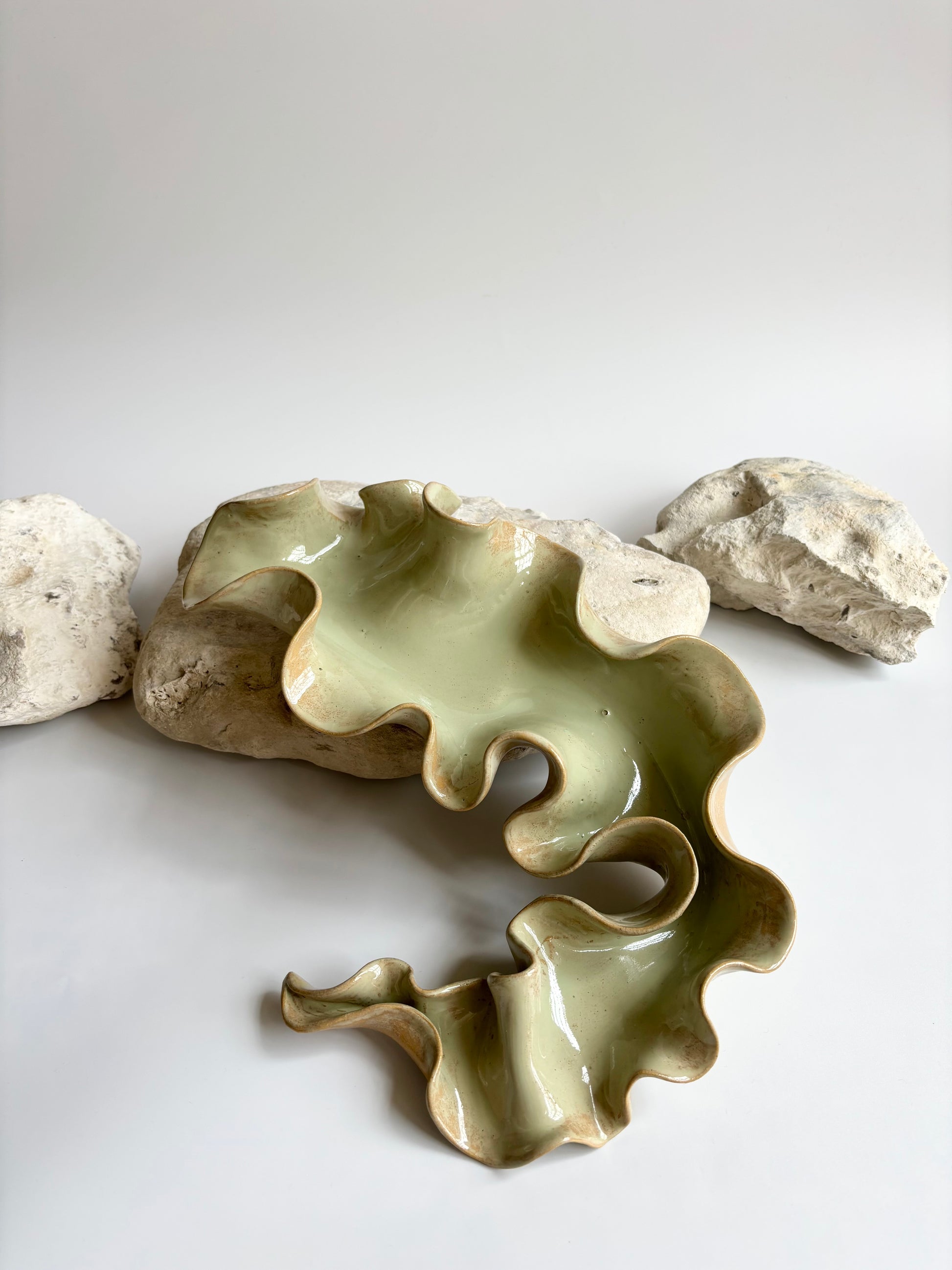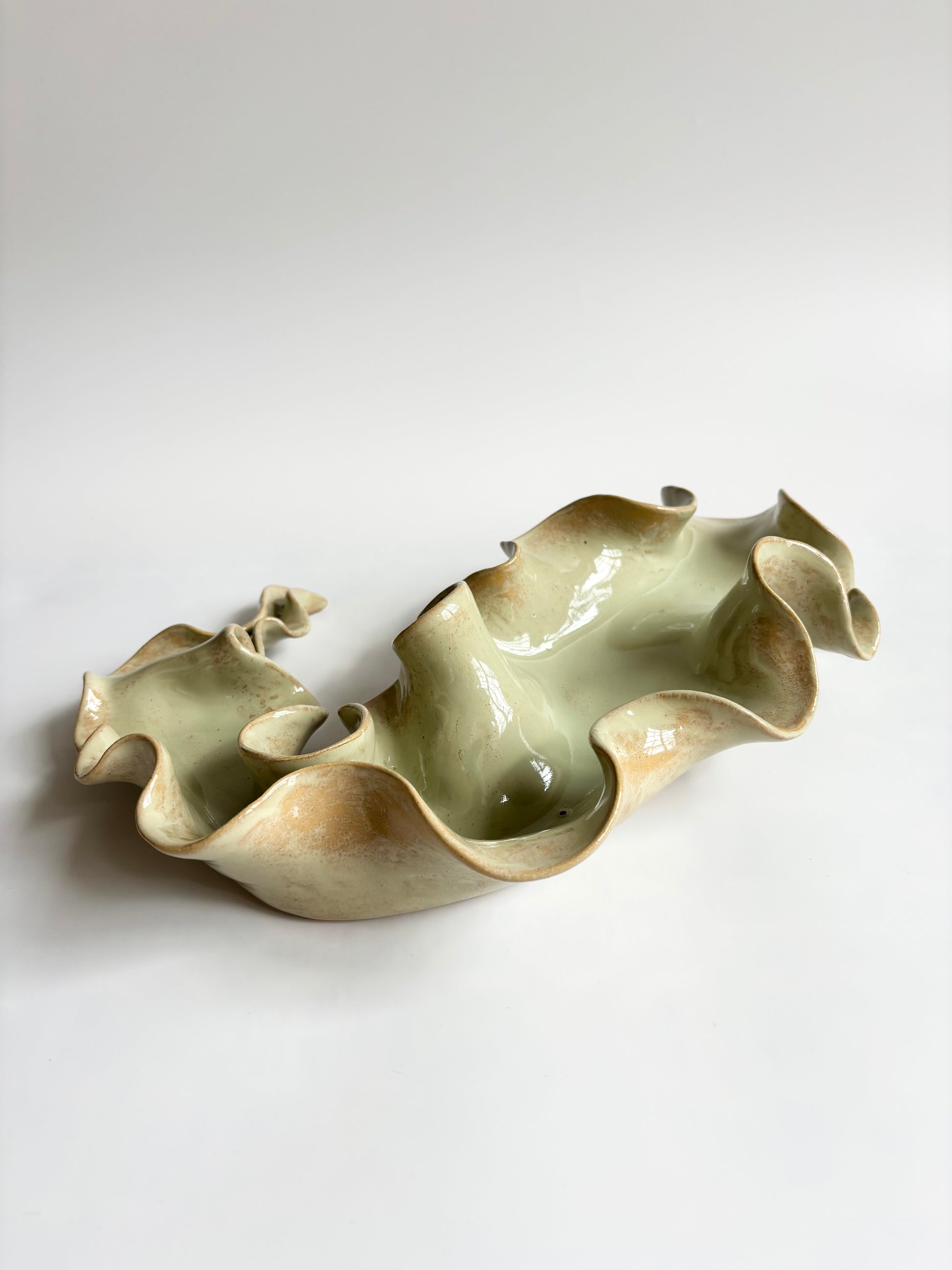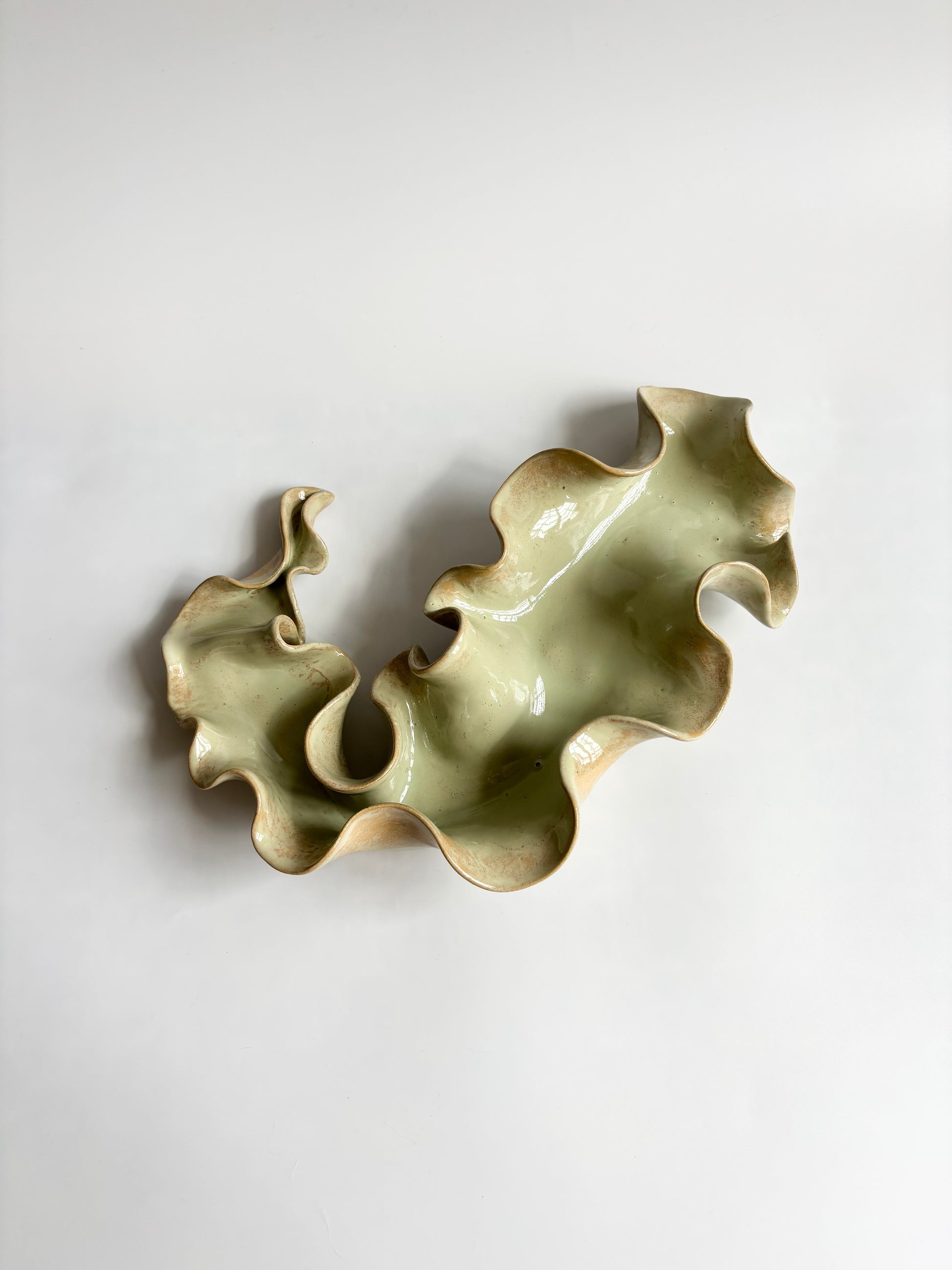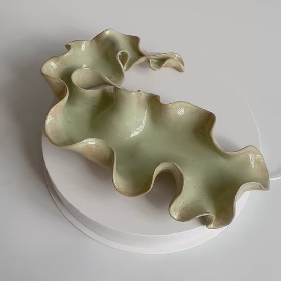 Beskrivelse: Elegant bordskulptur med et bølgende og rytmisk udtryk. Glaseret med en sart grøn glasur, der bryder over tekstur og dermed giver et transparent og skrøbeligt udtryk ligesom tangplanten, når den står svajende under vandet mens solens stråler bryder igennem dens tynde bladstruktur.