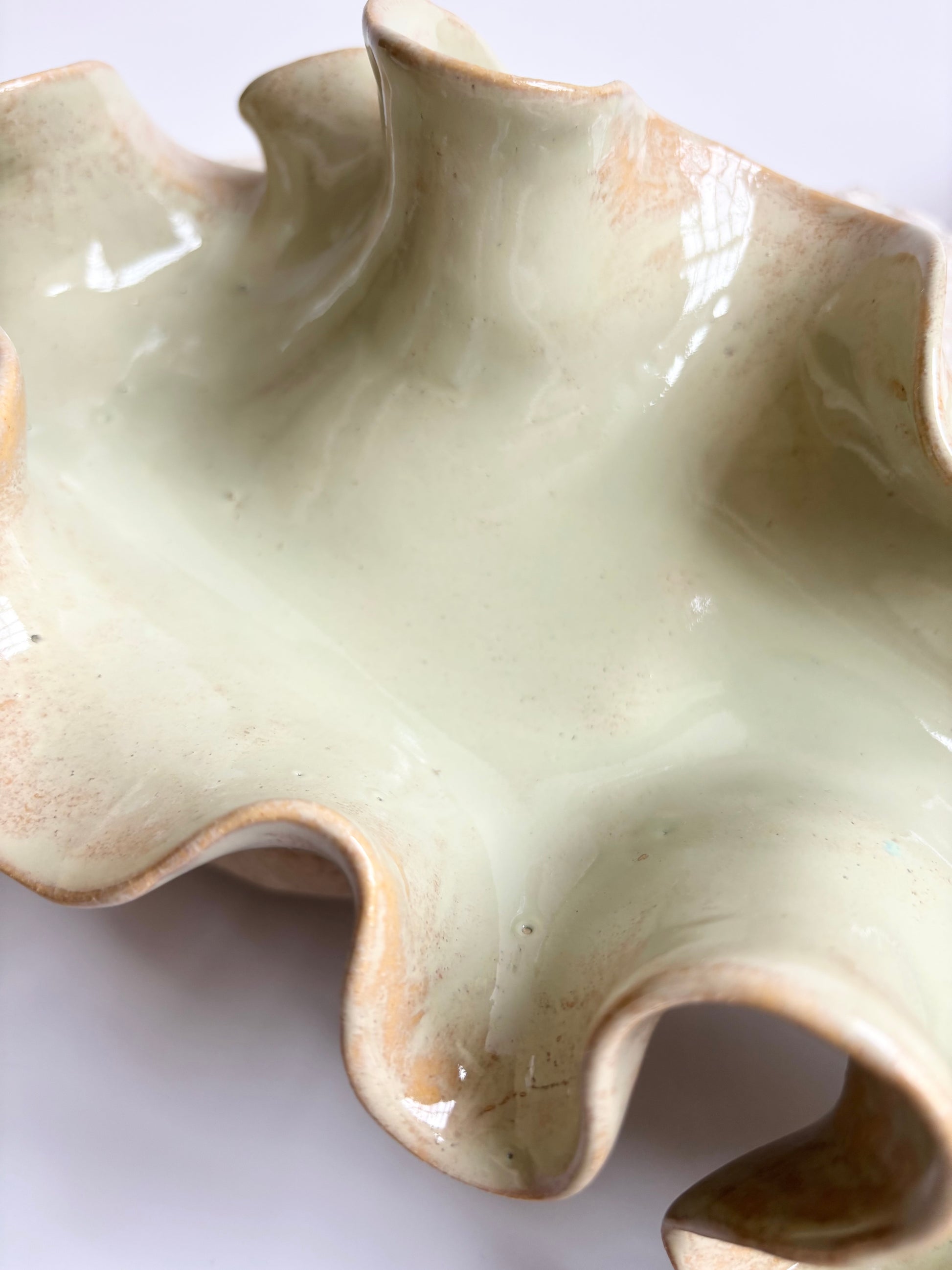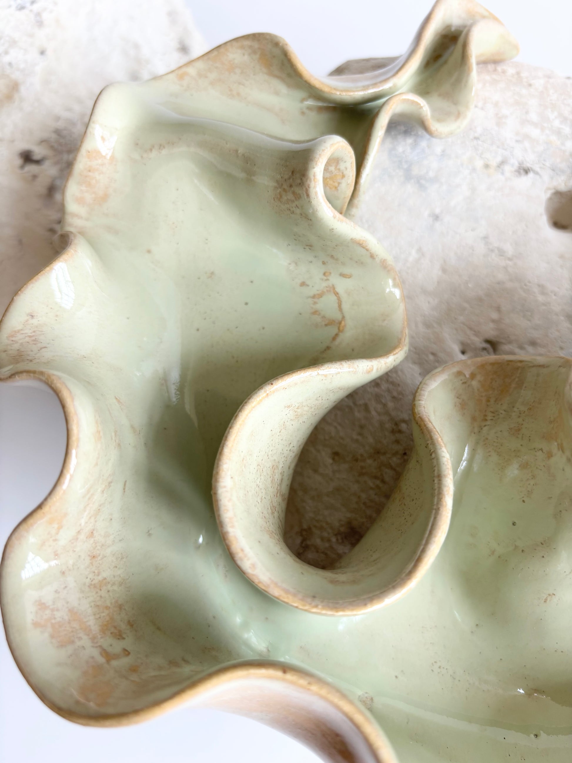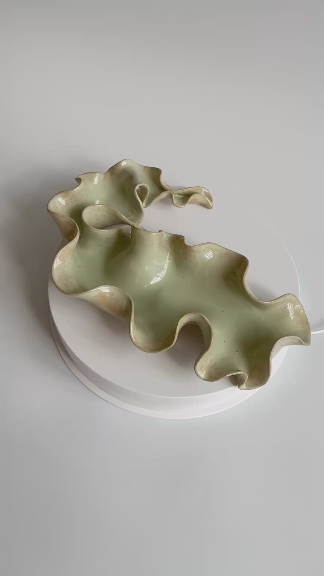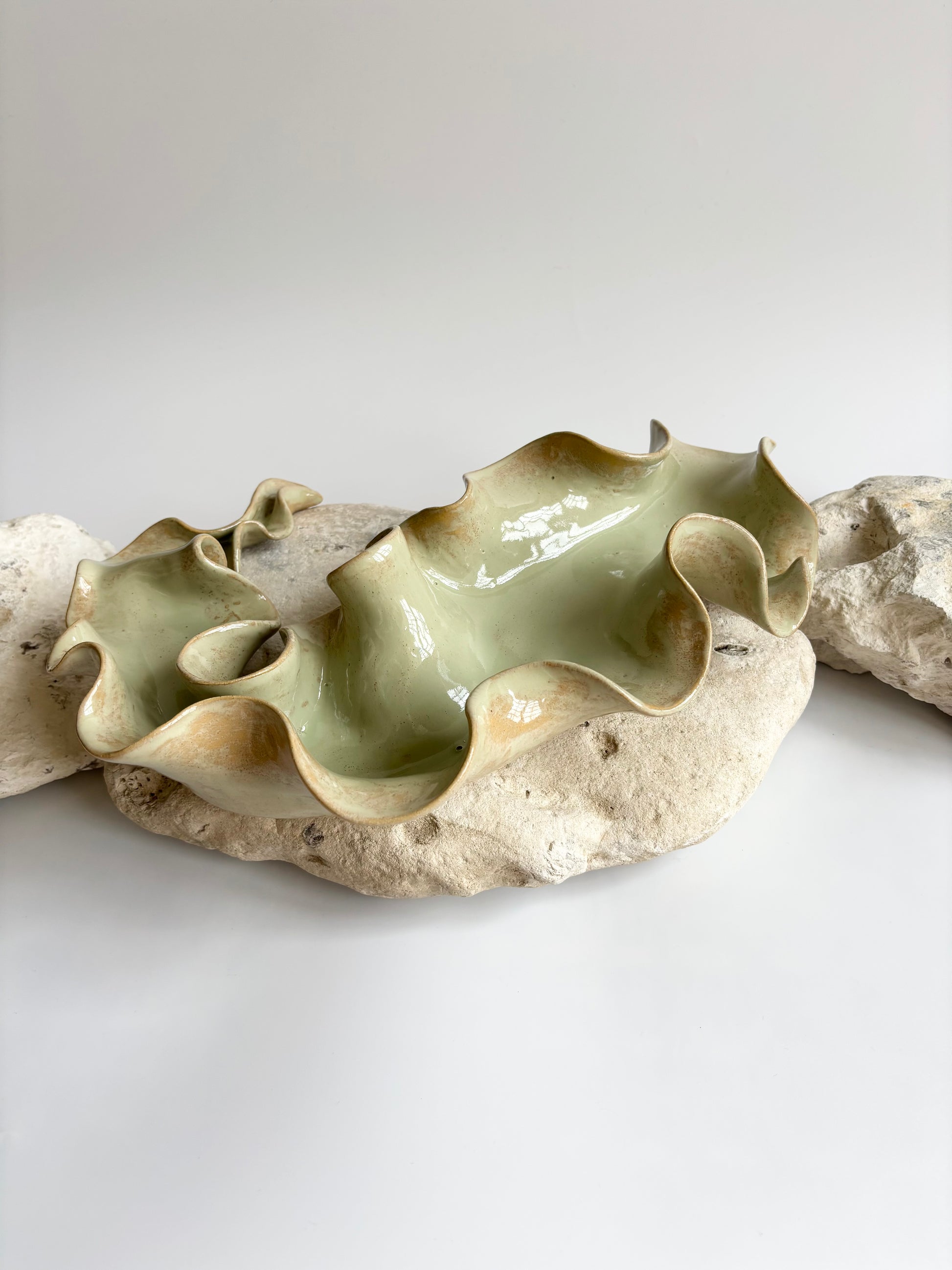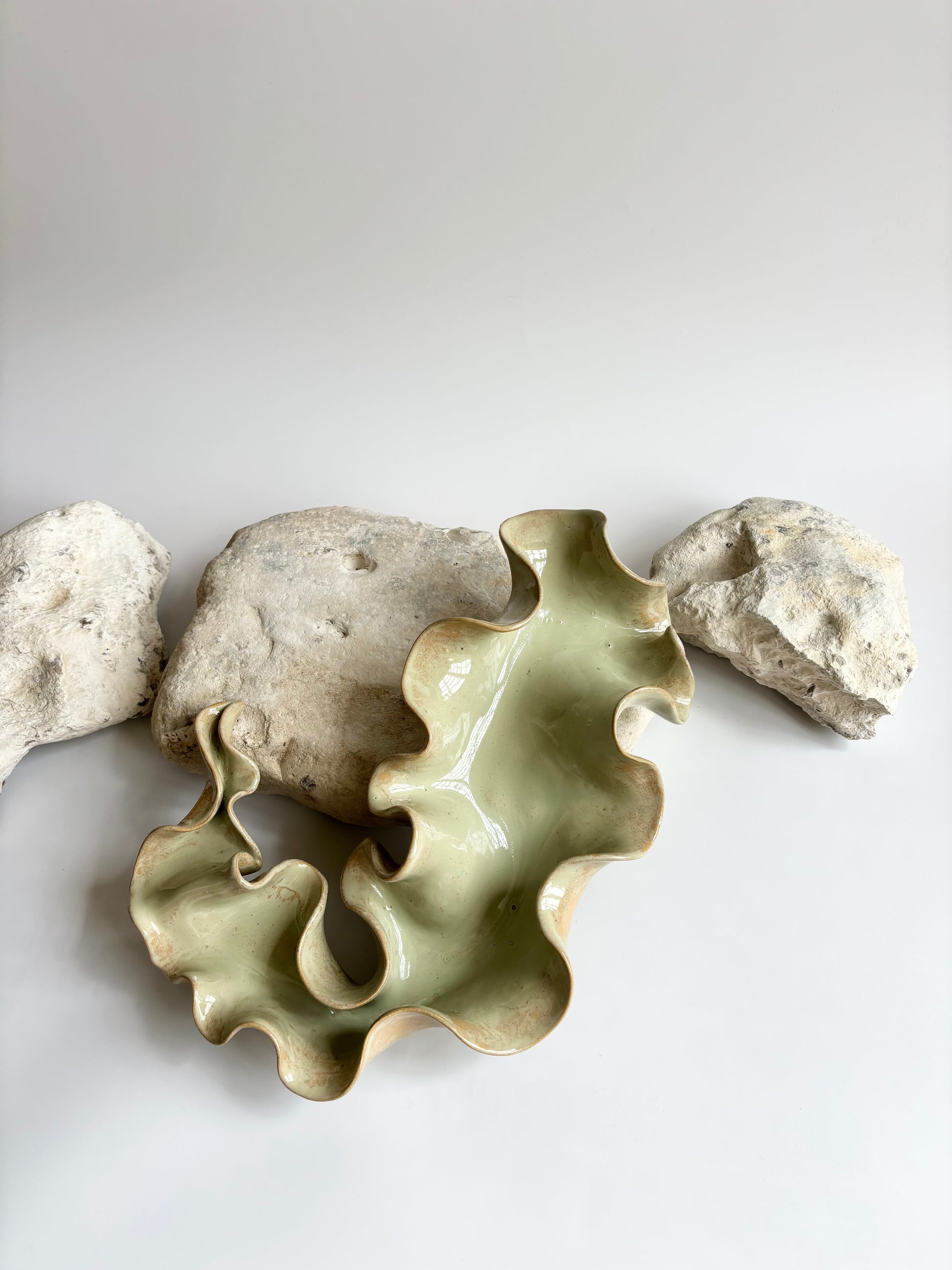 Beskrivelse: Elegant bordskulptur med et bølgende og rytmisk udtryk. Glaseret med en sart grøn glasur, der bryder over tekstur og dermed giver et transparent og skrøbeligt udtryk ligesom tangplanten, når den står svajende under vandet mens solens stråler bryder igennem dens tynde bladstruktur.