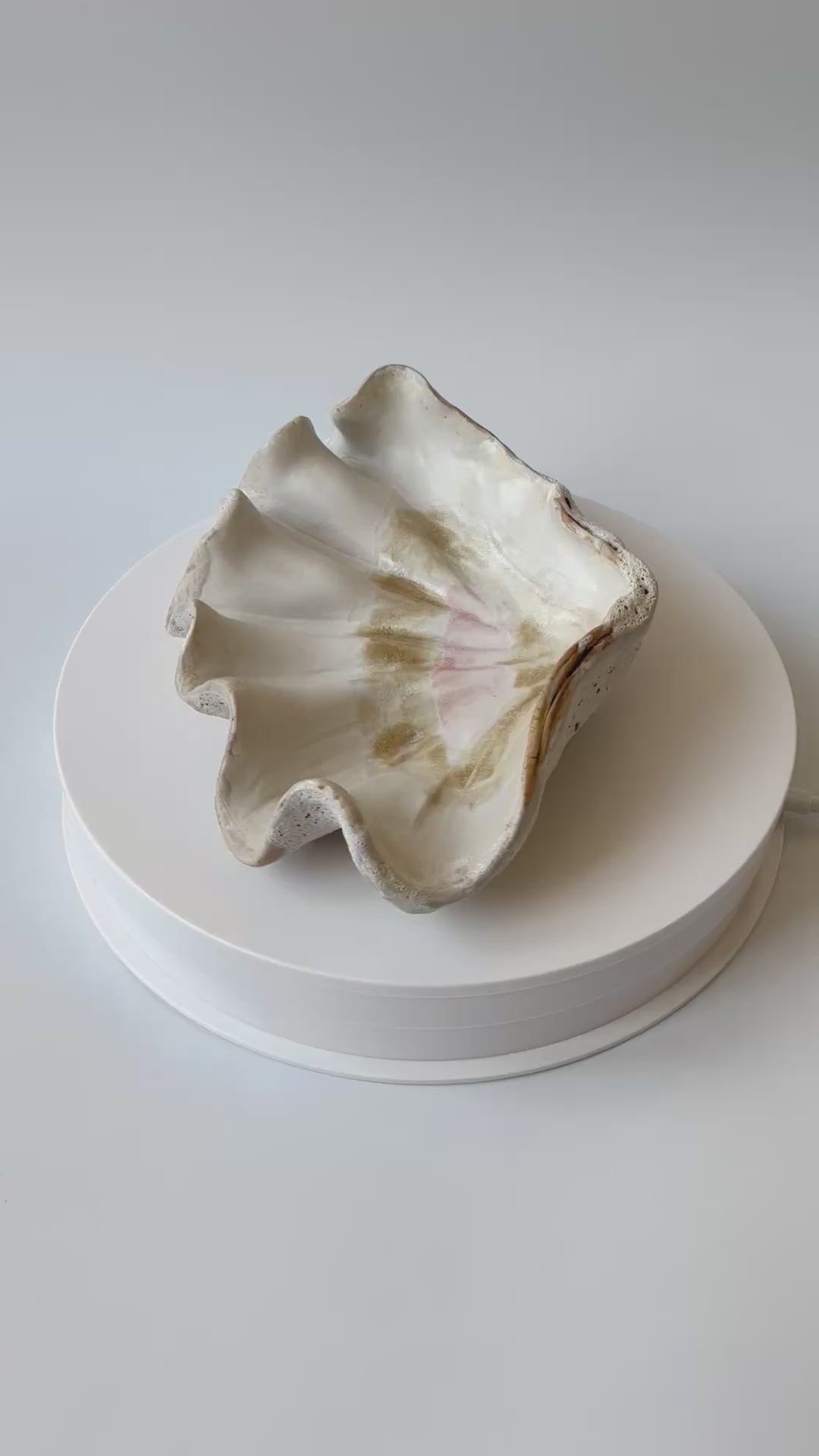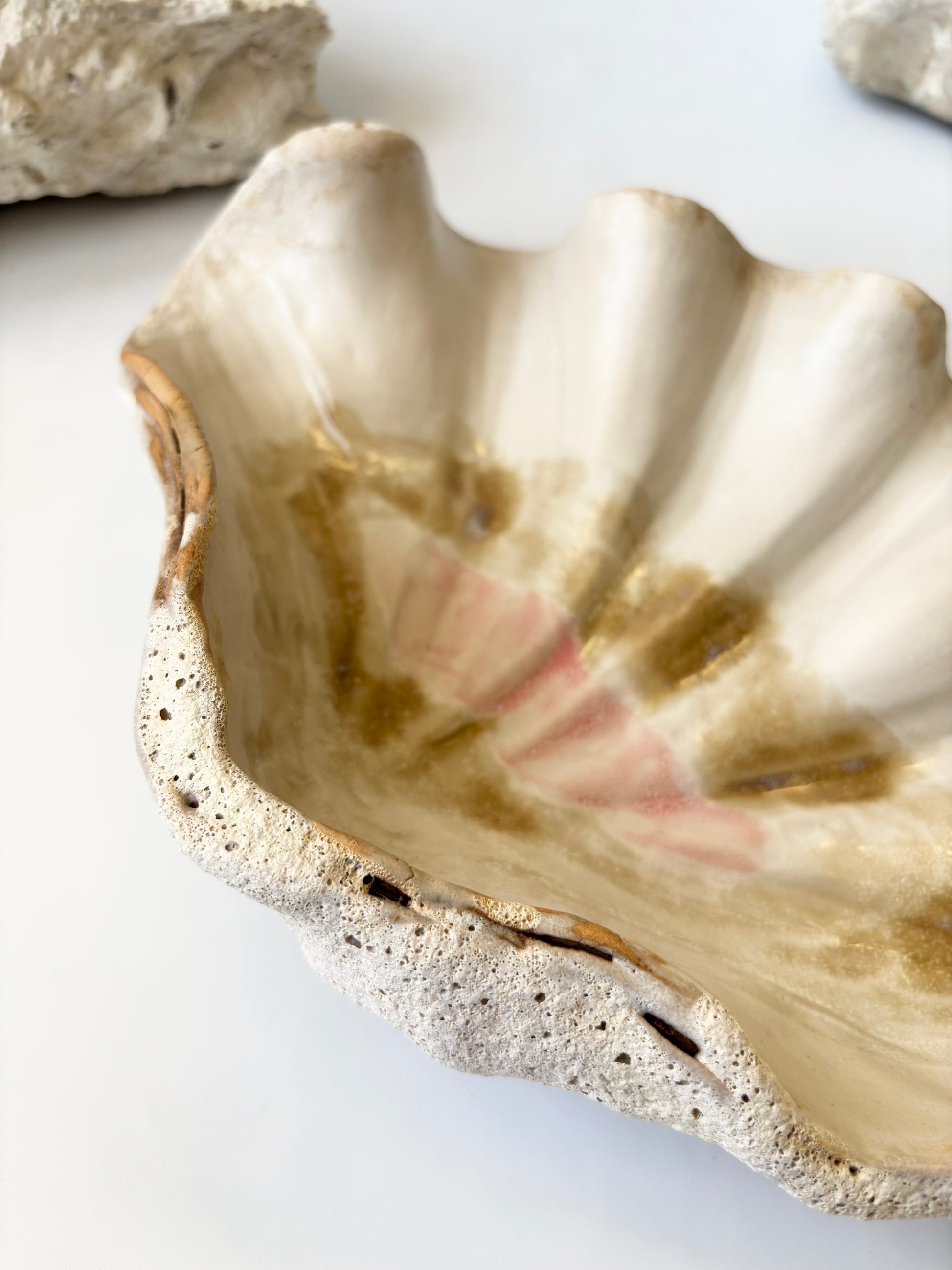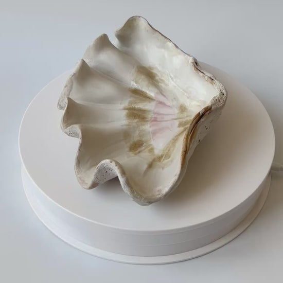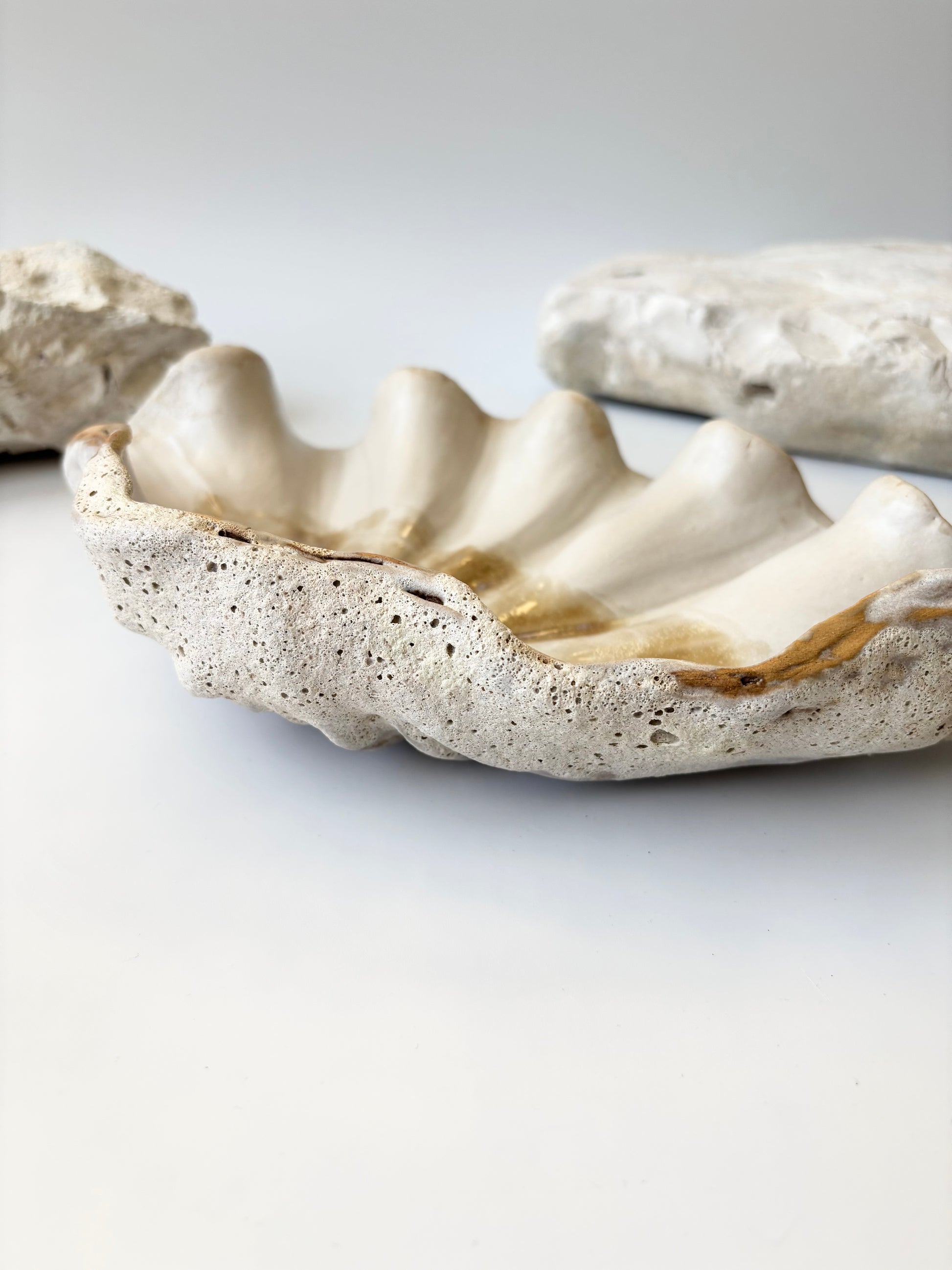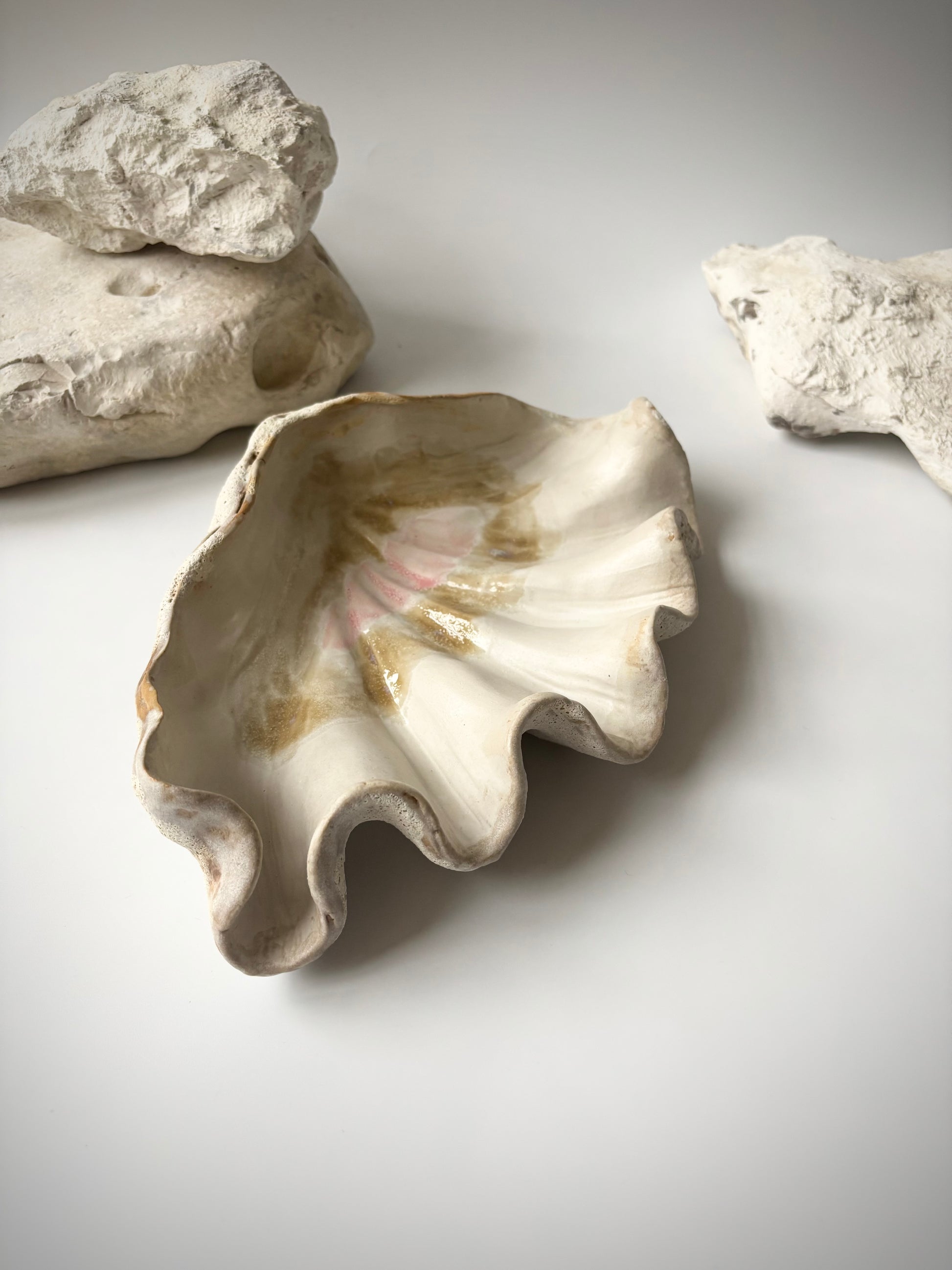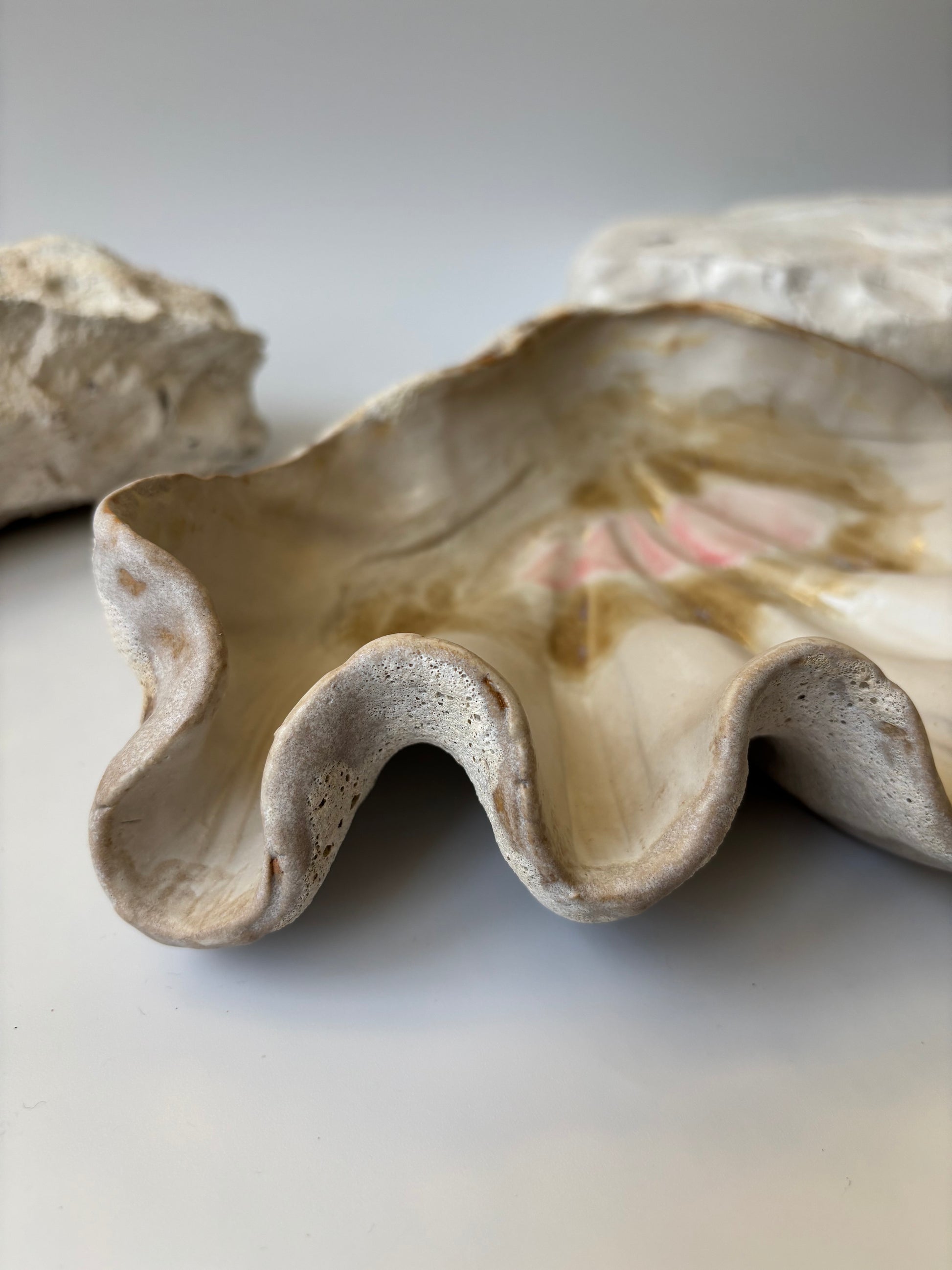 Beskrivelse: Håndbygget skulptur / fad med en bølgende form inspireret af muslinger og andre strandskaller. Fadets ydre er glaseret i en rå kalkhvid glasur med magmatekstur. Indeni, en mat hvid glasur med sarte brune og lyserøde nuancer.