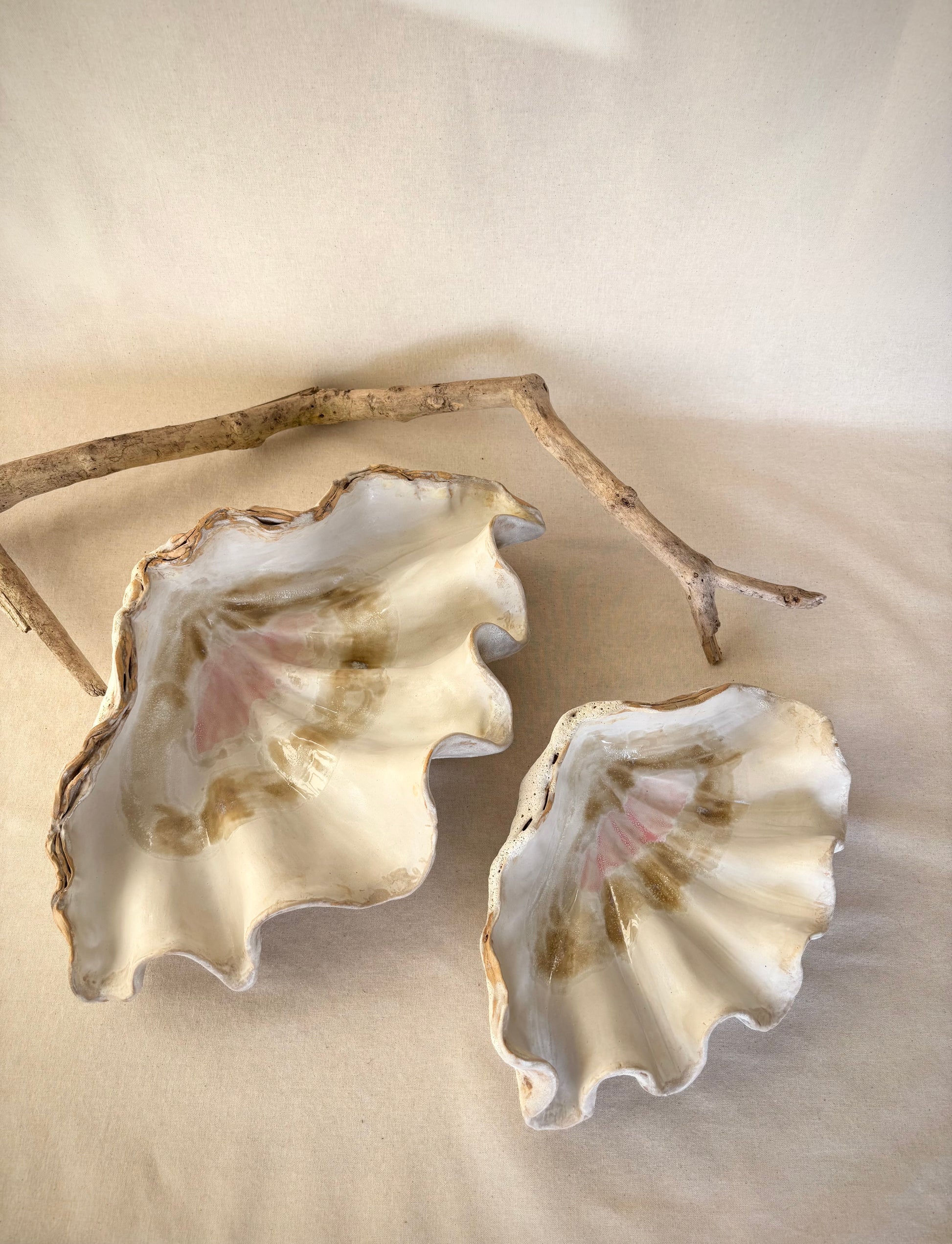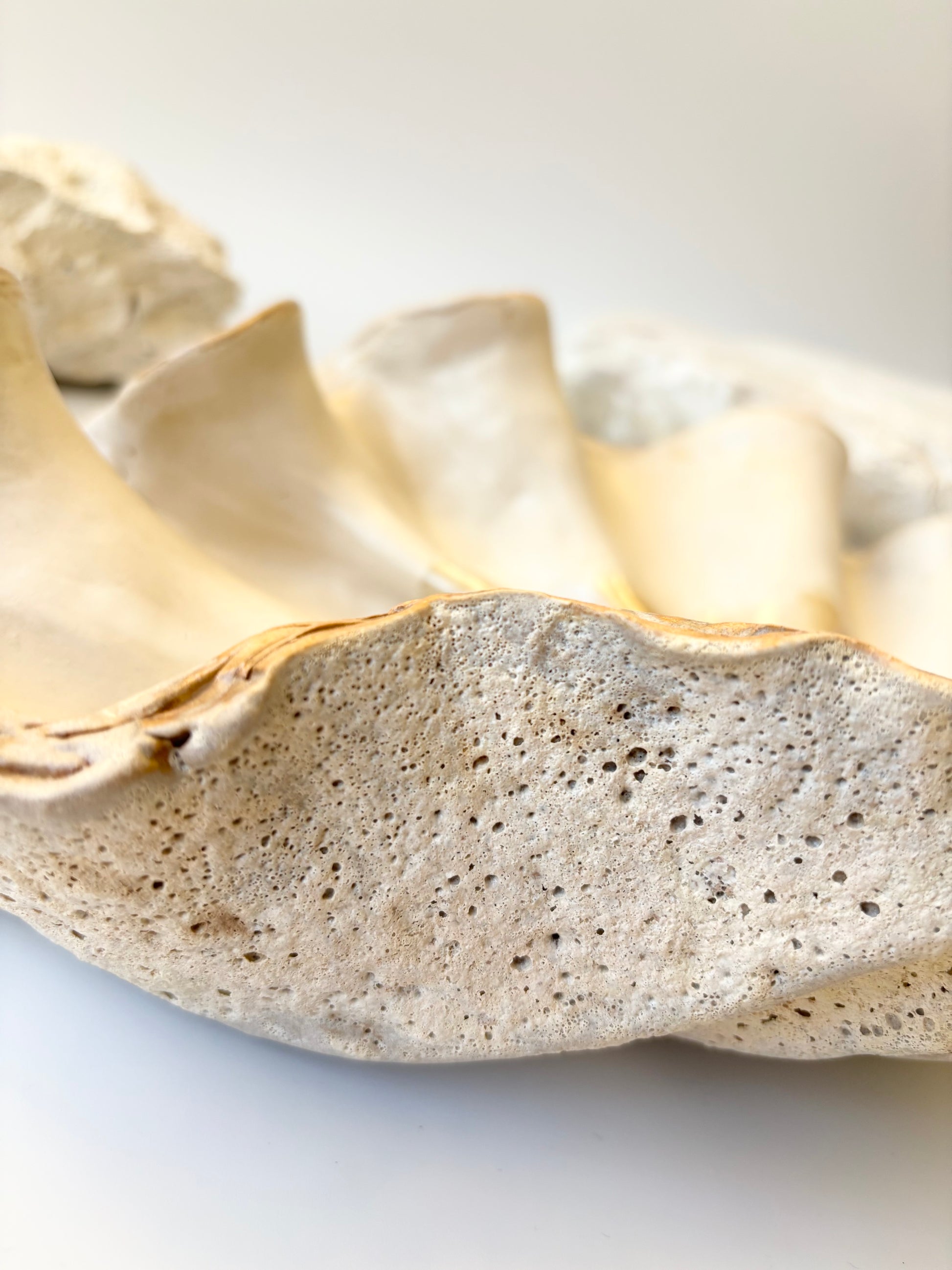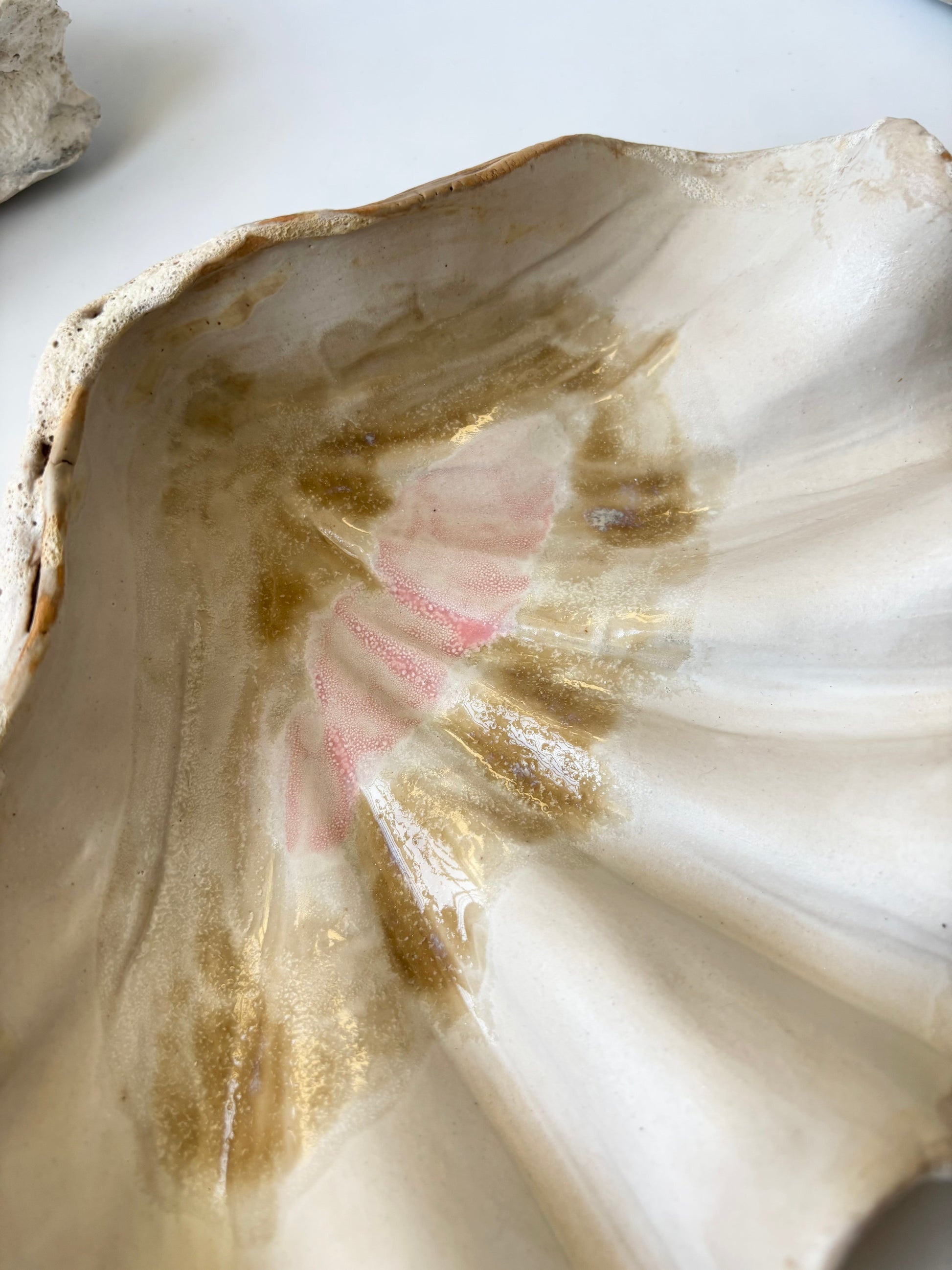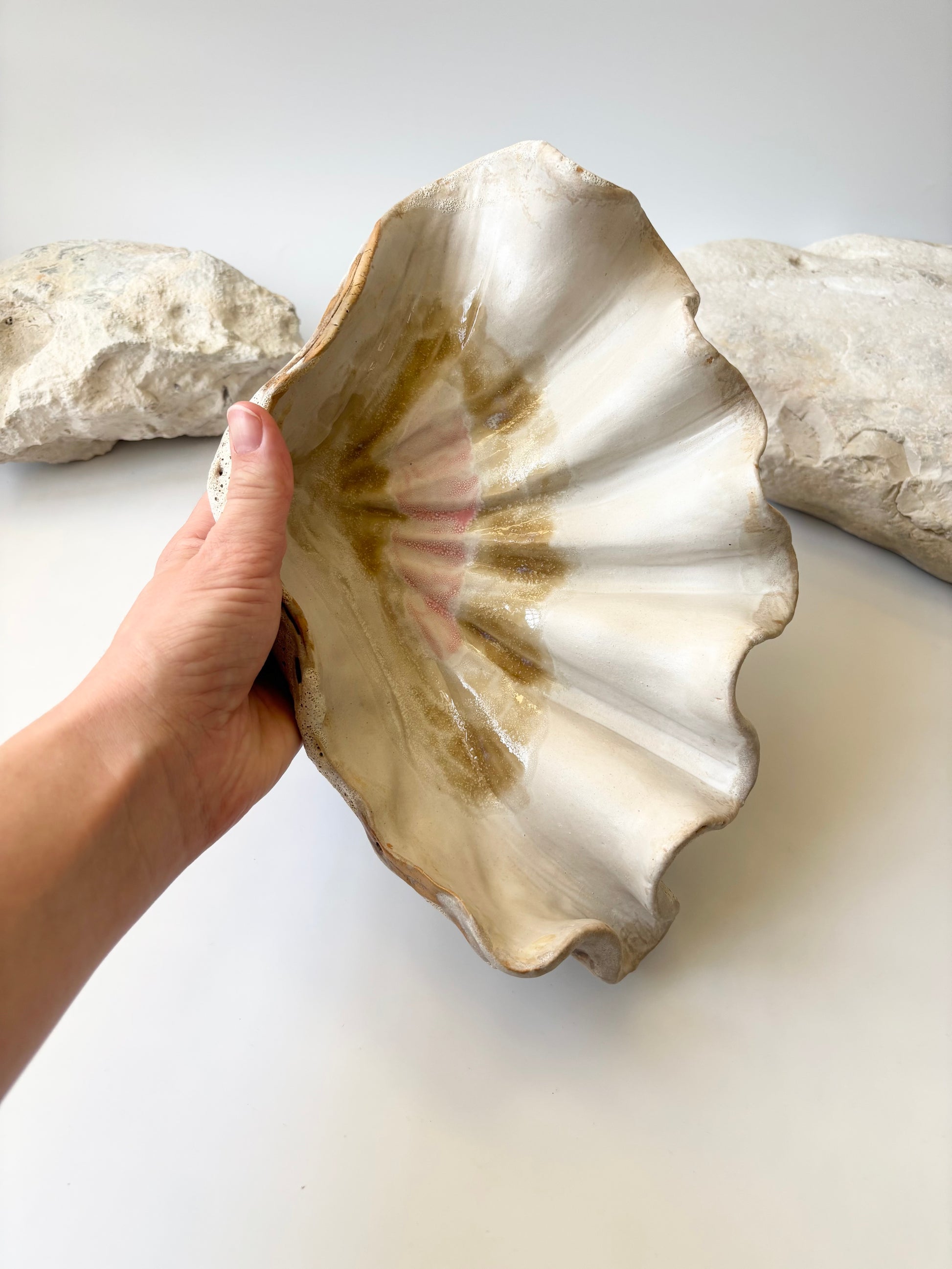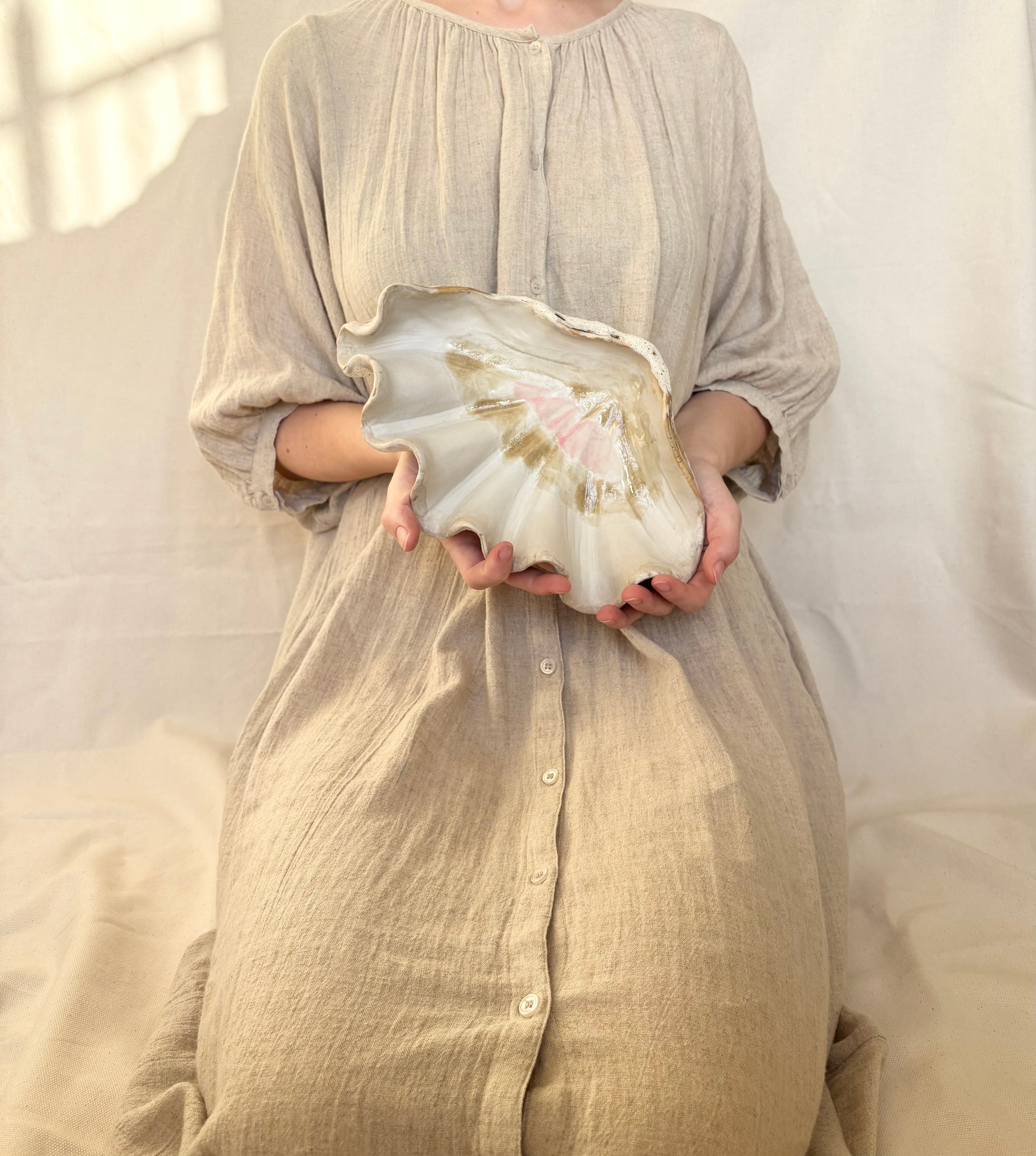 Beskrivelse: Håndbygget skulptur / fad med en bølgende form inspireret af muslinger og andre strandskaller. Fadets ydre er glaseret i en rå kalkhvid glasur med magmatekstur. Indeni, en mat hvid glasur med sarte brune og lyserøde nuancer.