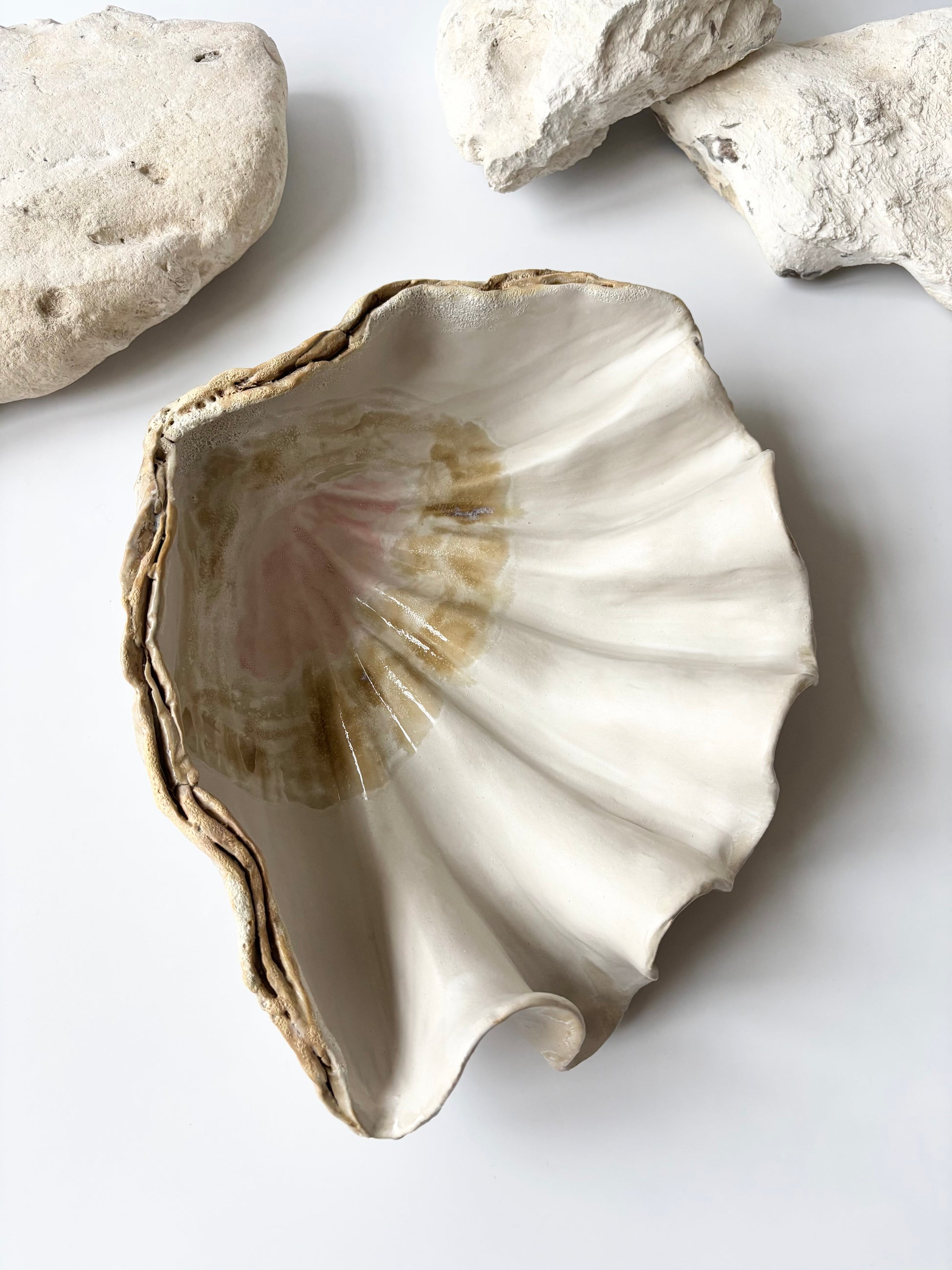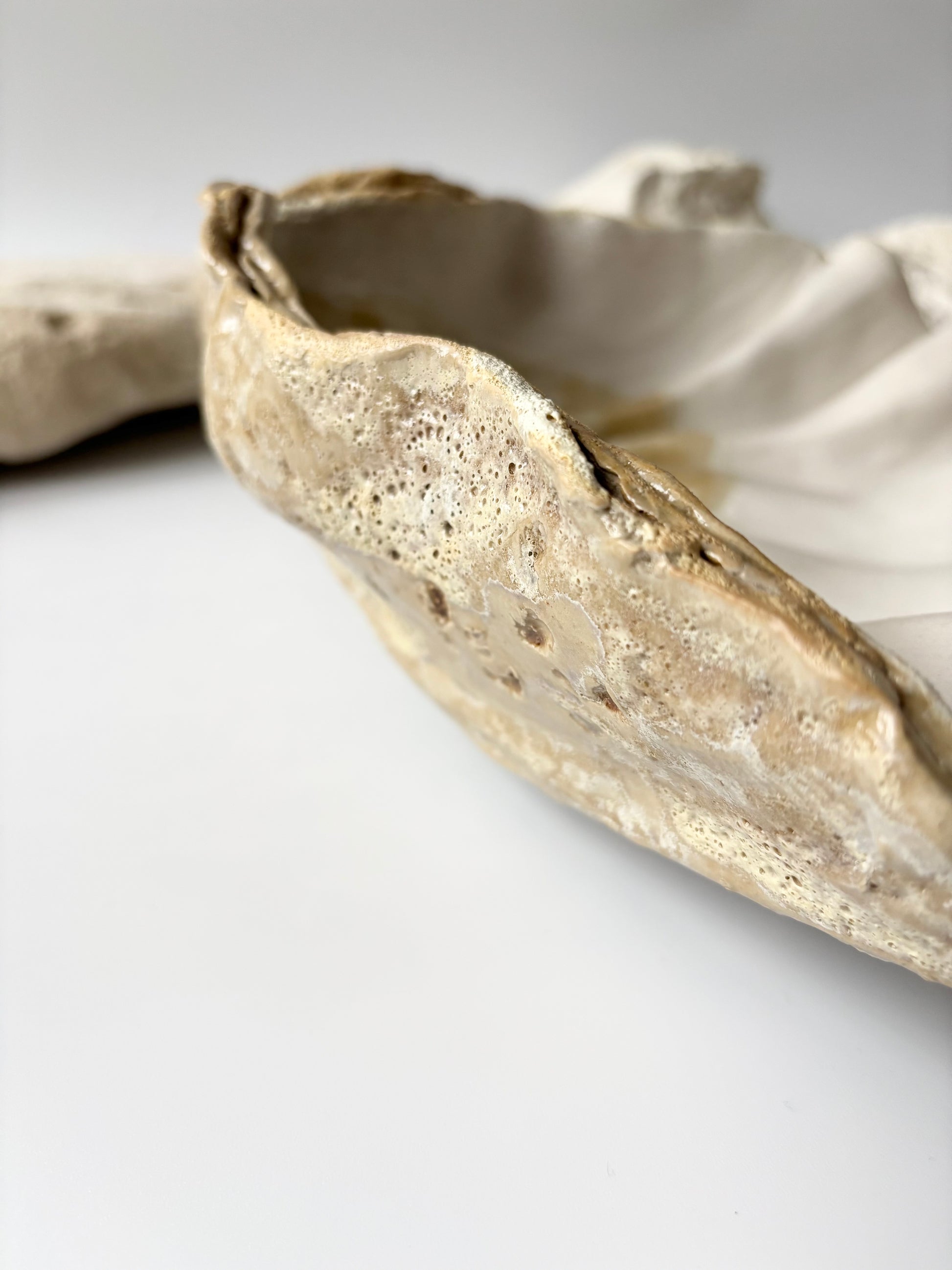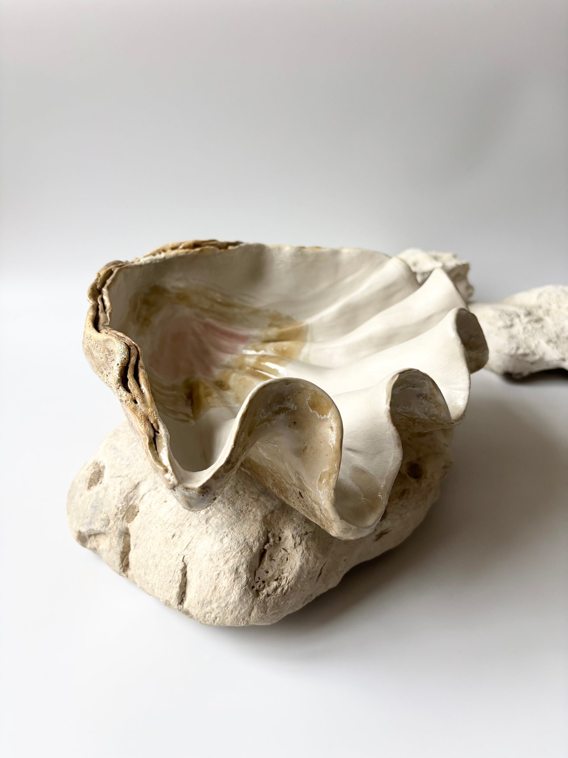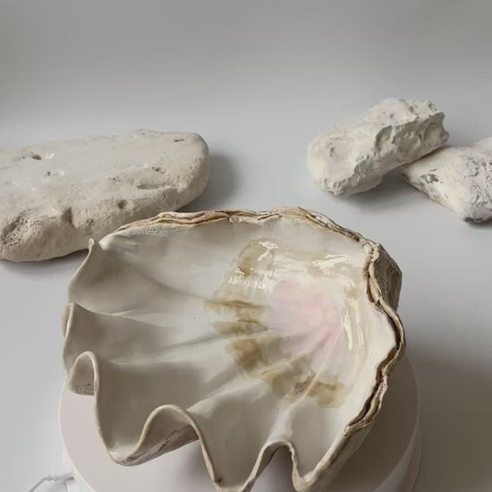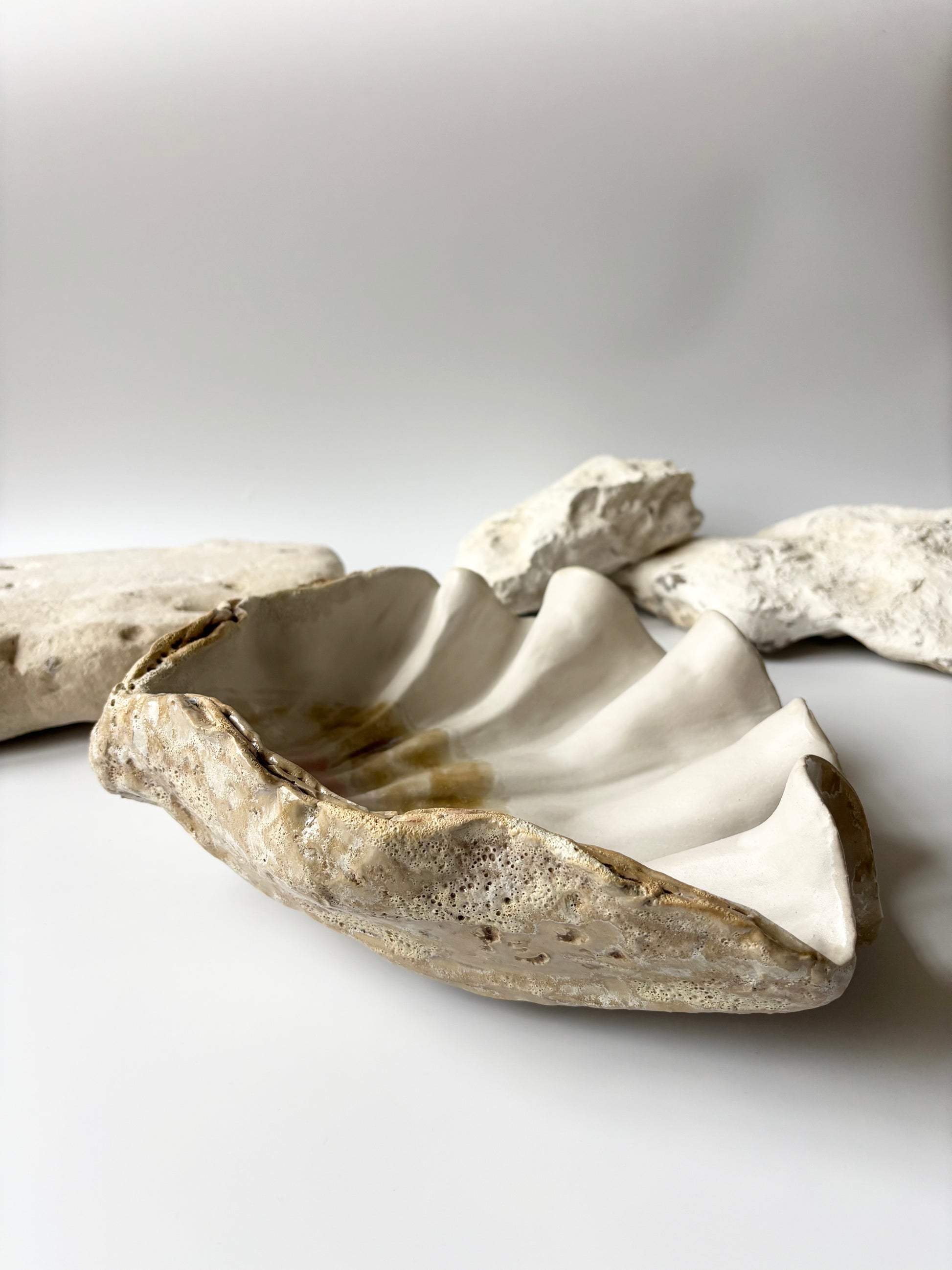 Beskrivelse: Håndbygget skulptur / fad med en bølgende form inspireret af muslinger og andre strandskaller. Fadets ydre er glaseret i en rå magma glasur med brune blanke nuancer. Indeni, en mat hvid glasur med sarte brune og lyserøde nuancer.