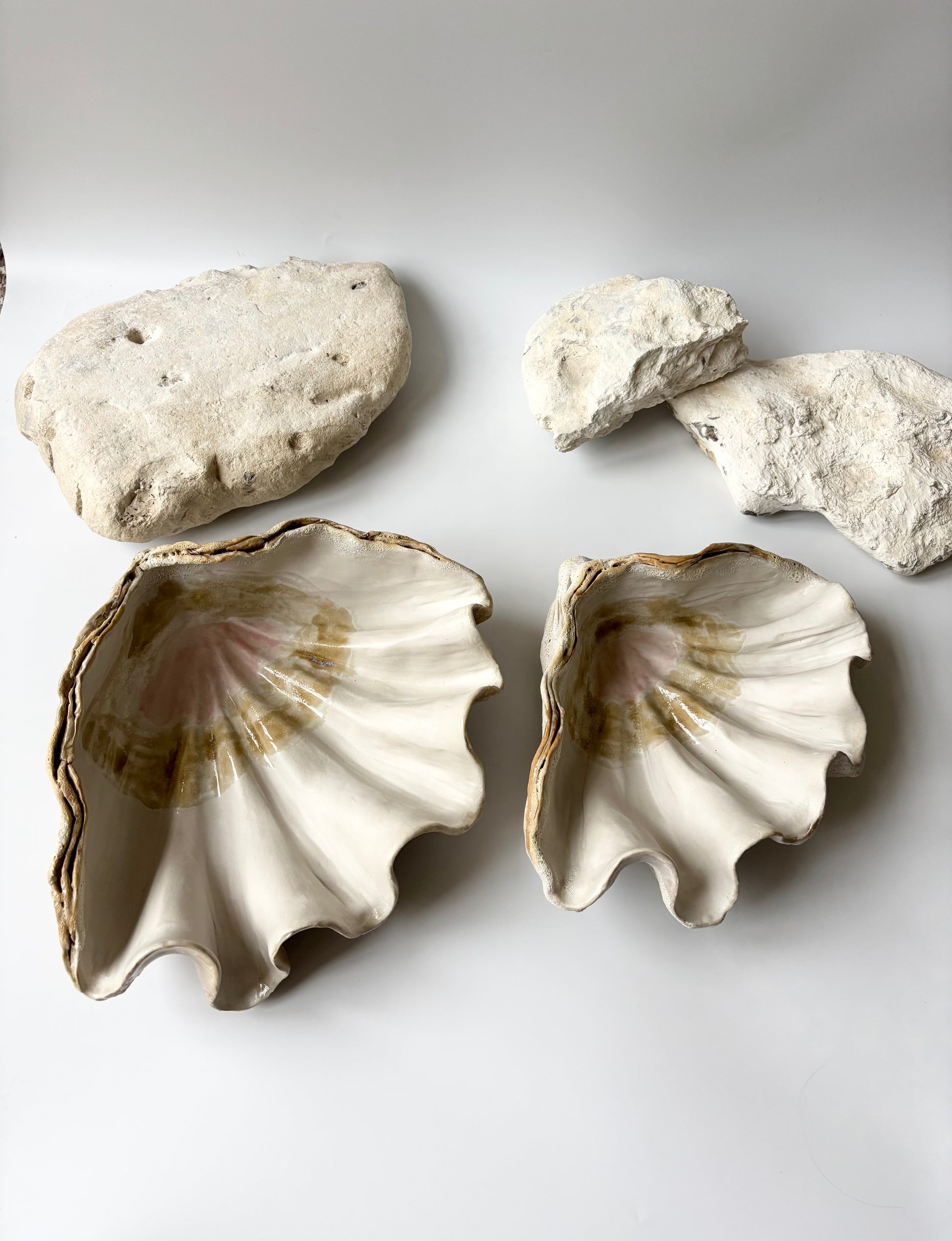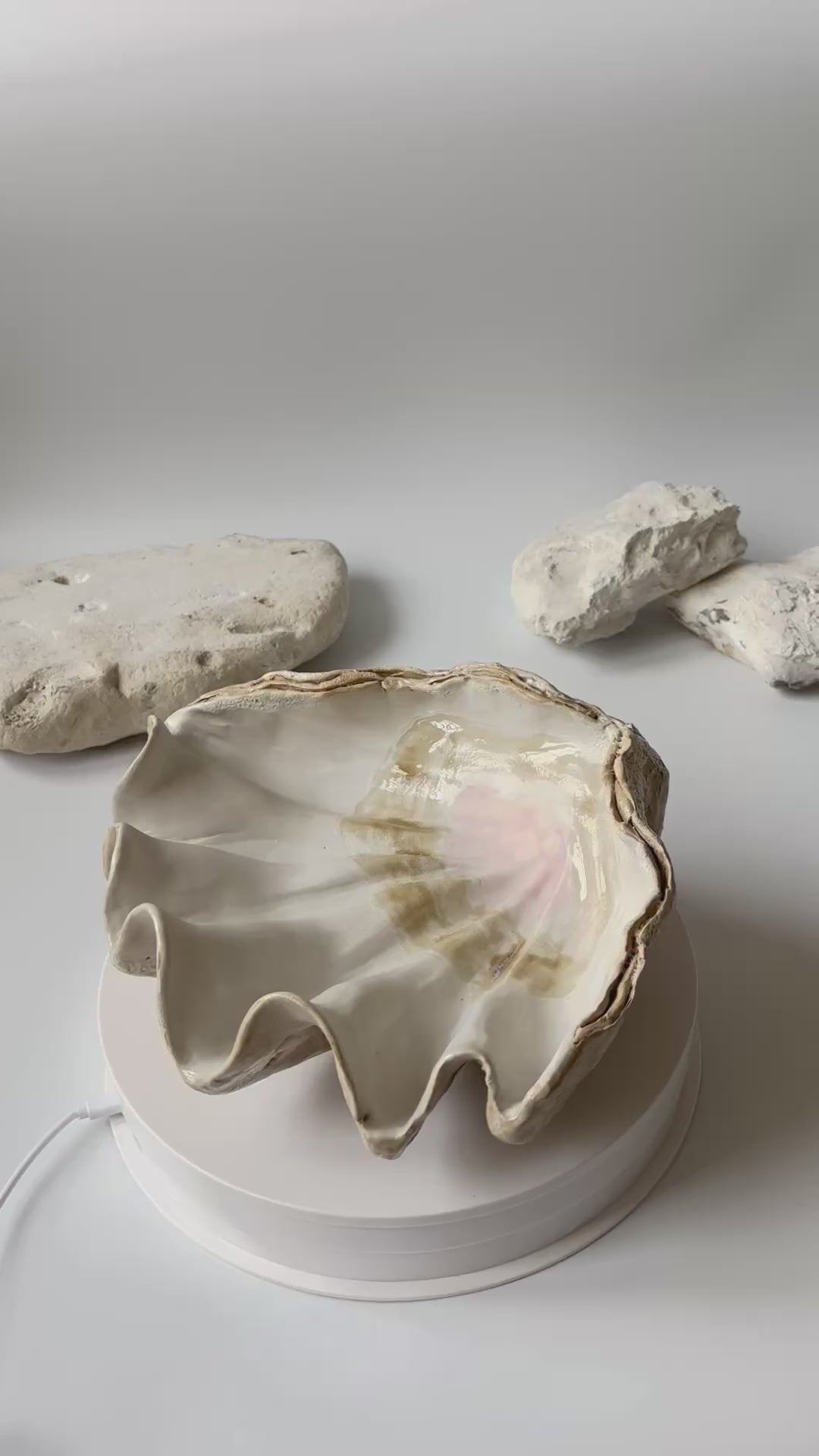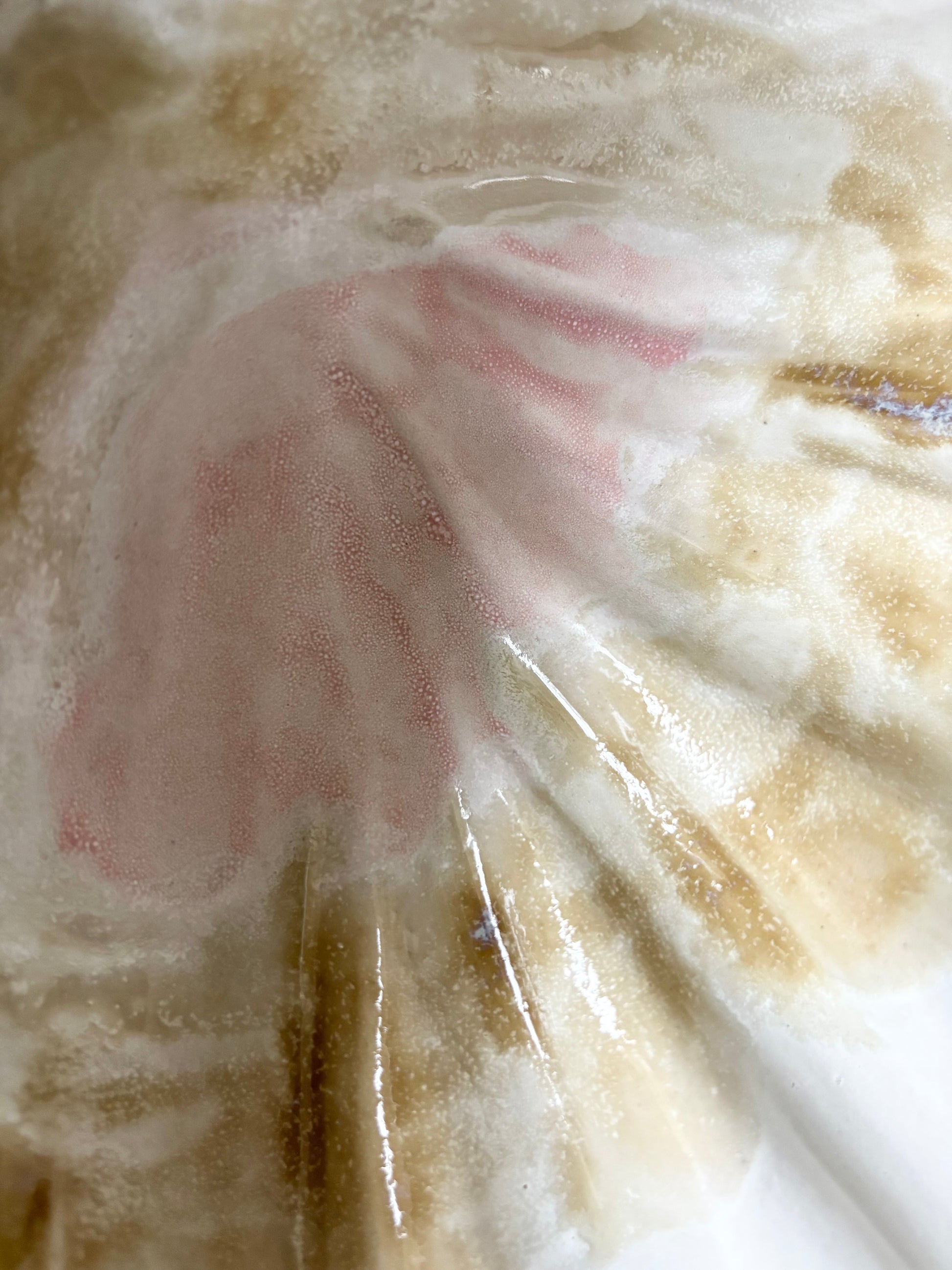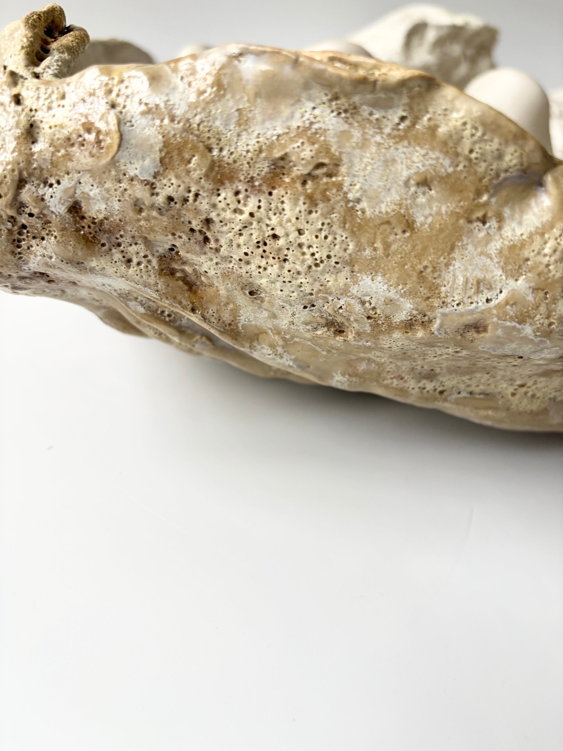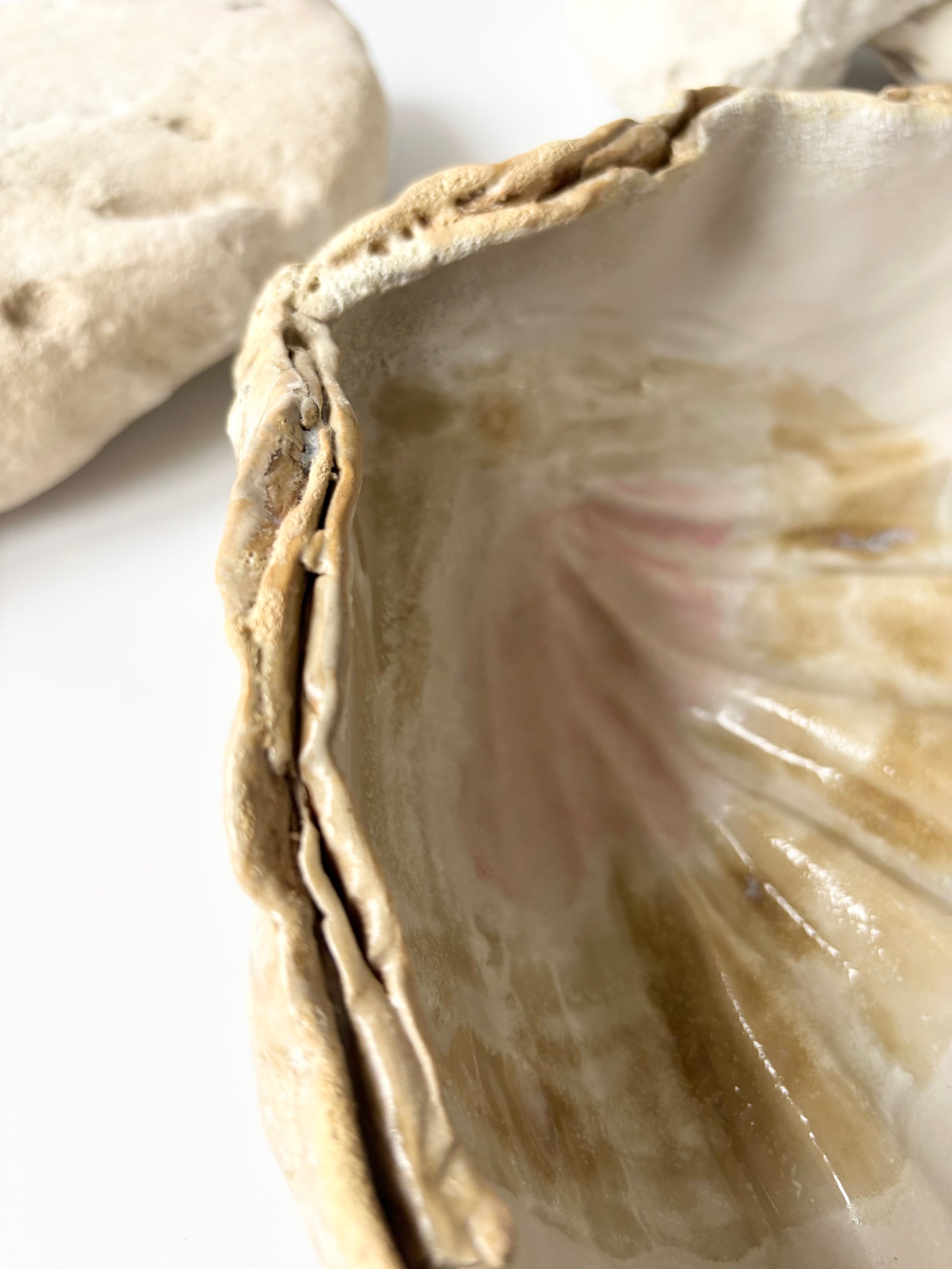 Beskrivelse: Håndbygget skulptur / fad med en bølgende form inspireret af muslinger og andre strandskaller. Fadets ydre er glaseret i en rå magma glasur med brune blanke nuancer. Indeni, en mat hvid glasur med sarte brune og lyserøde nuancer.
