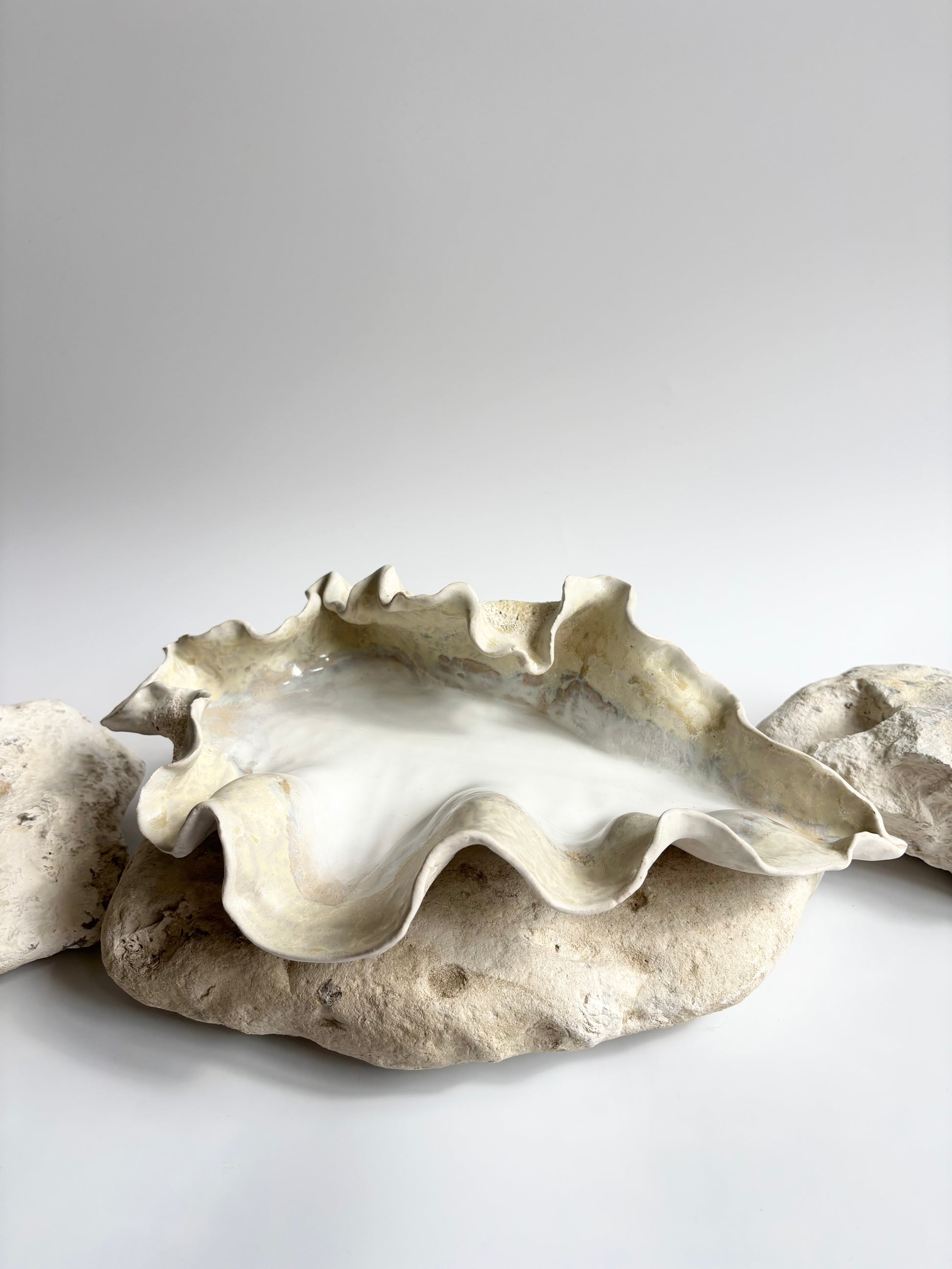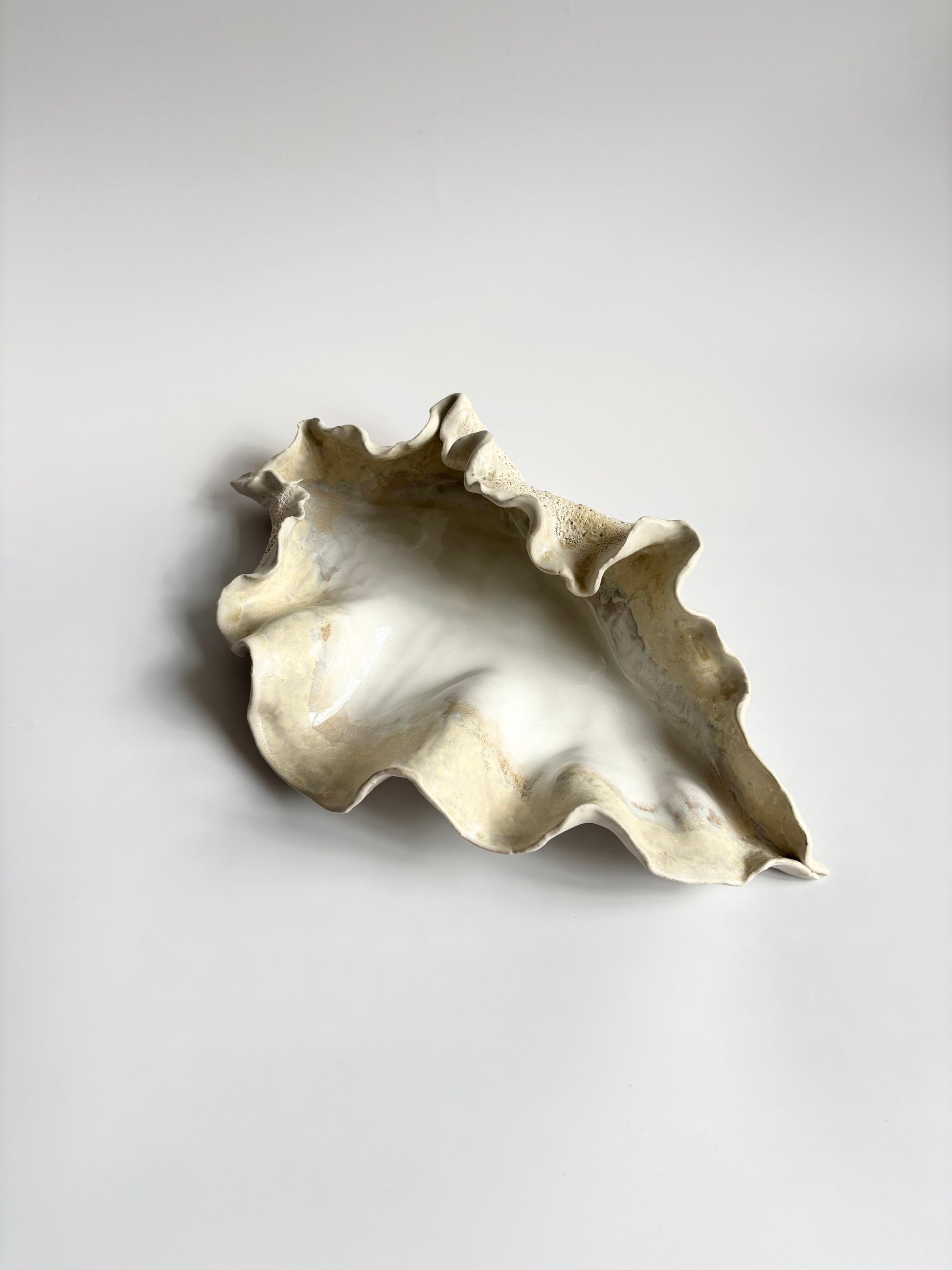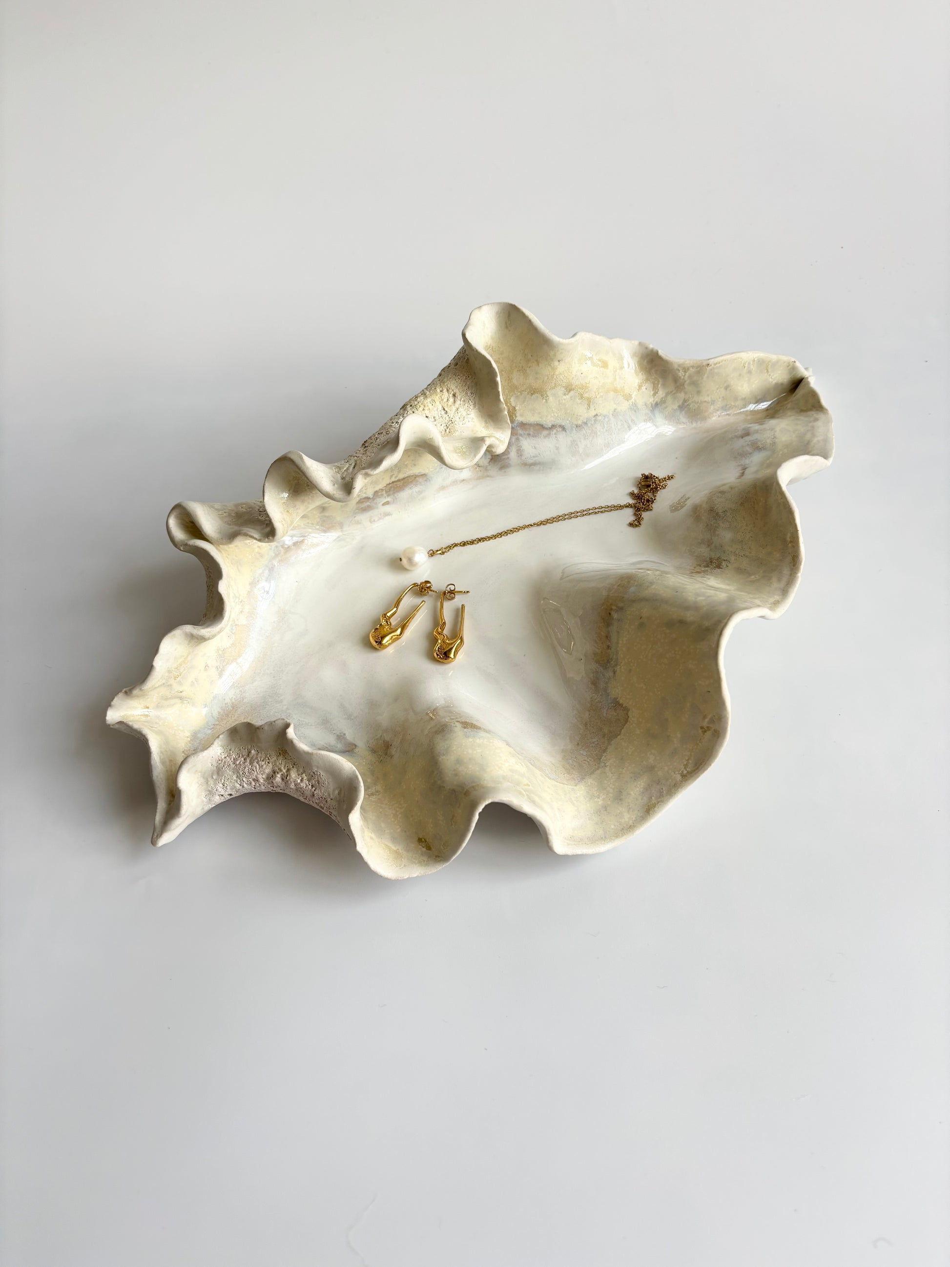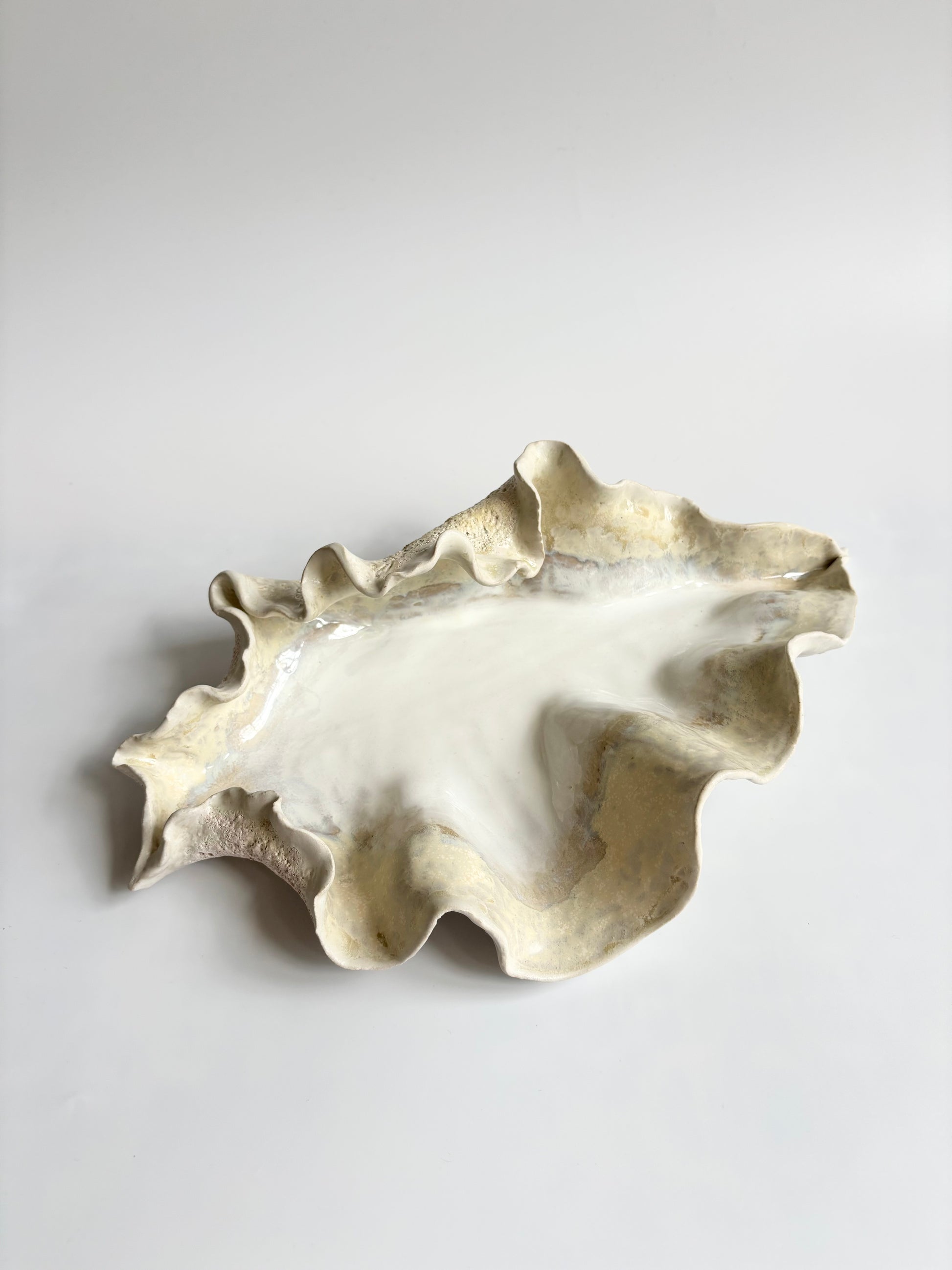 Beskrivelse: Håndbygget skulptur / fad med en svævende og bølgende form. Fadets ydre er glaseret med en mat kalkhvid og beige glasur kombineret med en glasur med magma-effekt, der tilfører et råt og sanseligt udtryk. På indersiden blanke glasurer i gradueringer af hvid og beige. Fadet kan bruges til at opbevare og udstille smykker som små skatte i strandskallen.