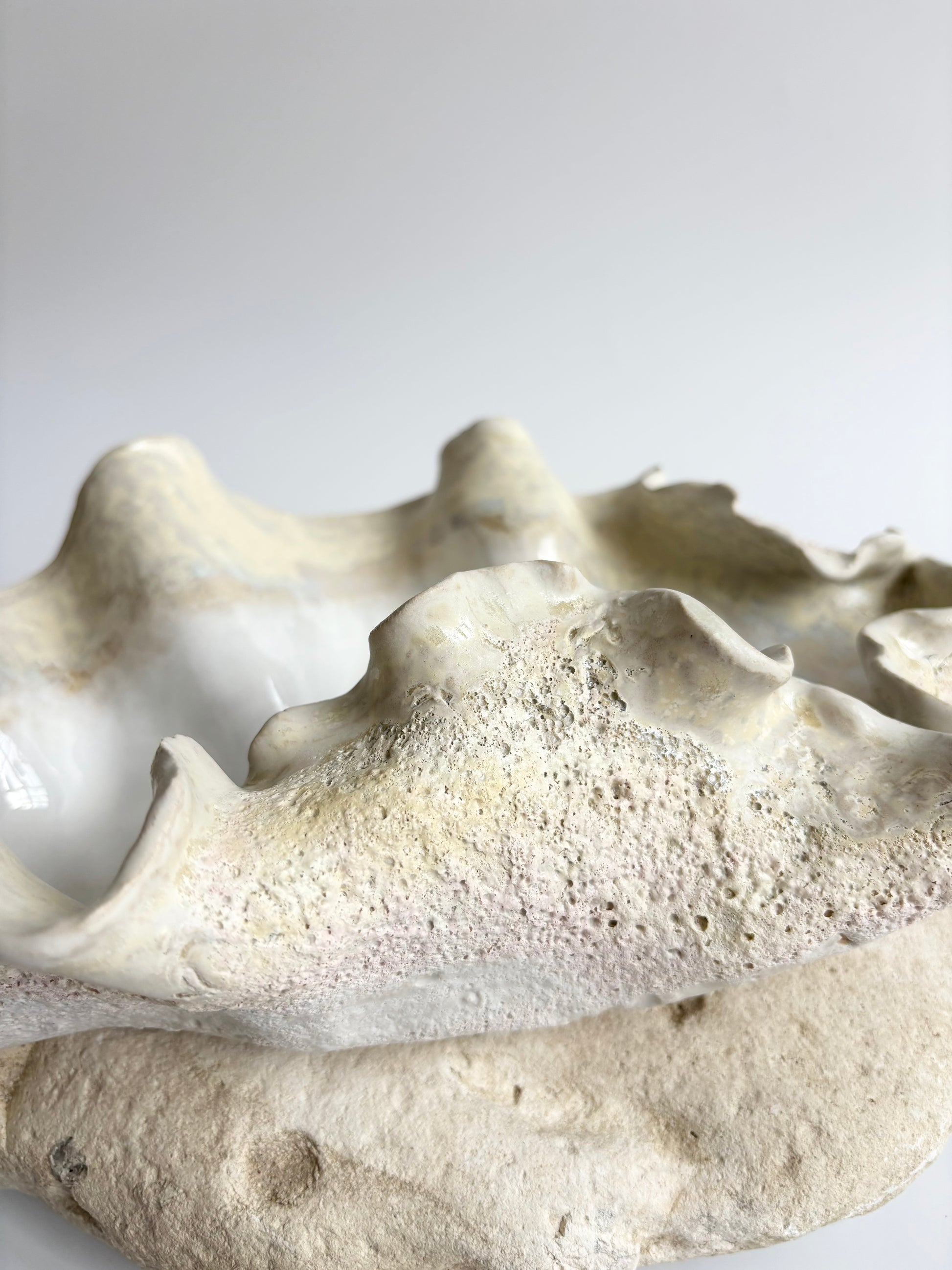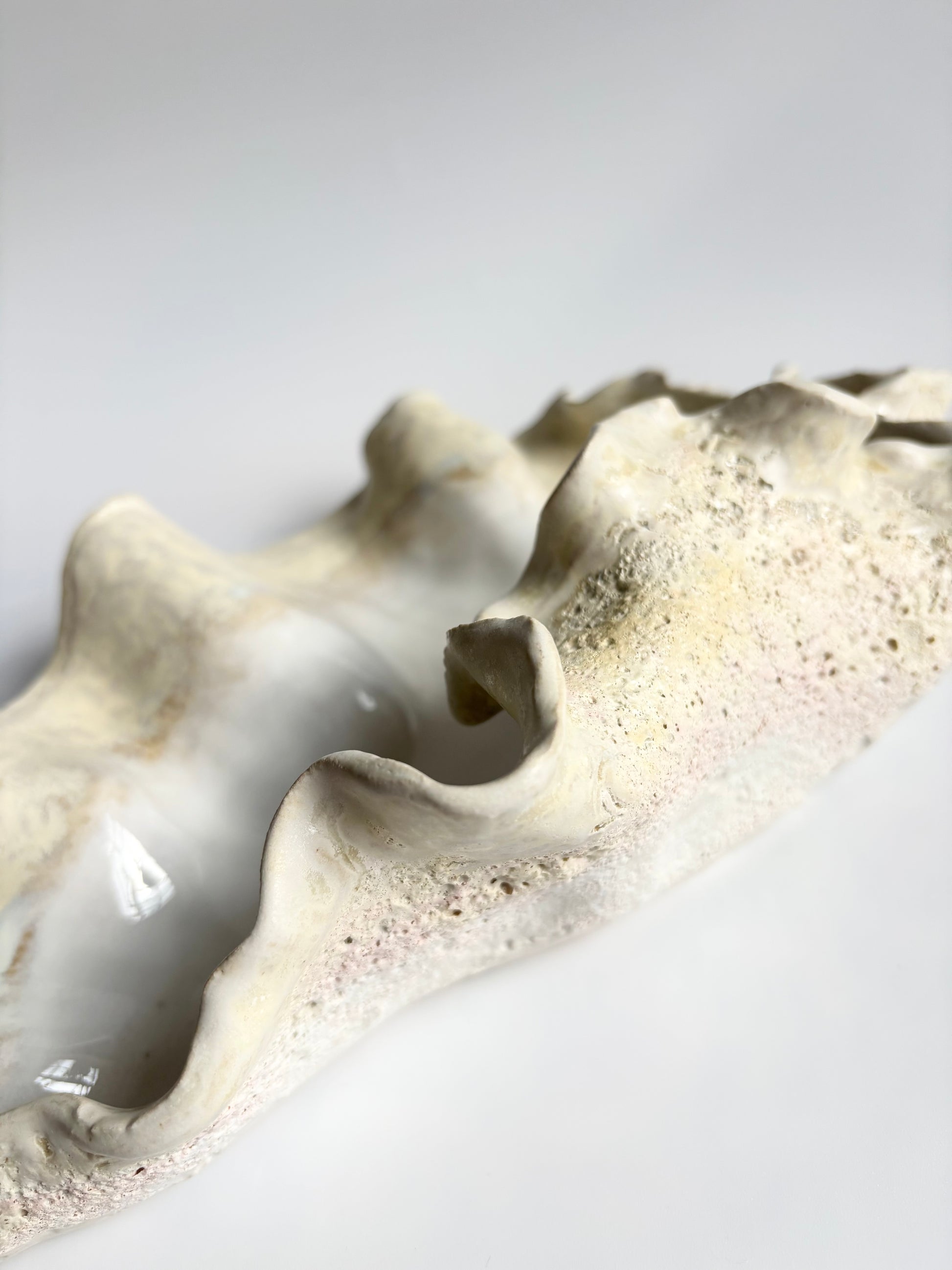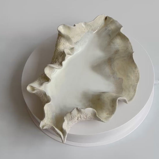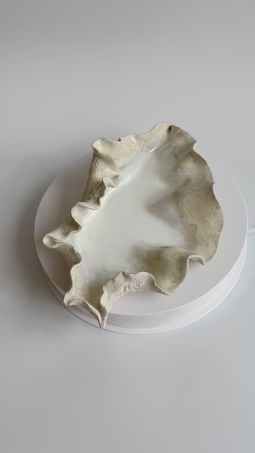Beskrivelse: Håndbygget skulptur / fad med en svævende og bølgende form. Fadets ydre er glaseret med en mat kalkhvid og beige glasur kombineret med en glasur med magma-effekt, der tilfører et råt og sanseligt udtryk. På indersiden blanke glasurer i gradueringer af hvid og beige. Fadet kan bruges til at opbevare og udstille smykker som små skatte i strandskallen.