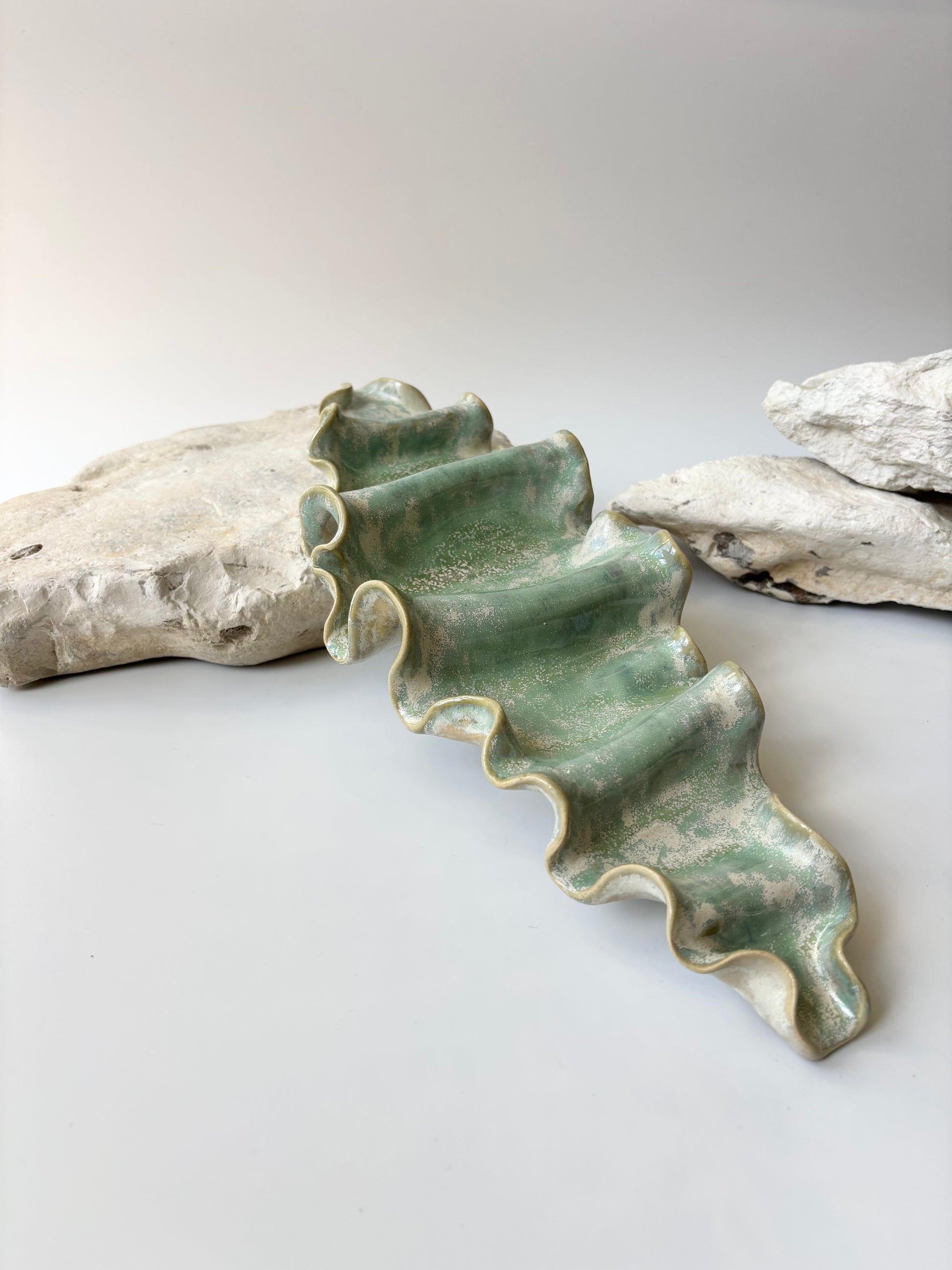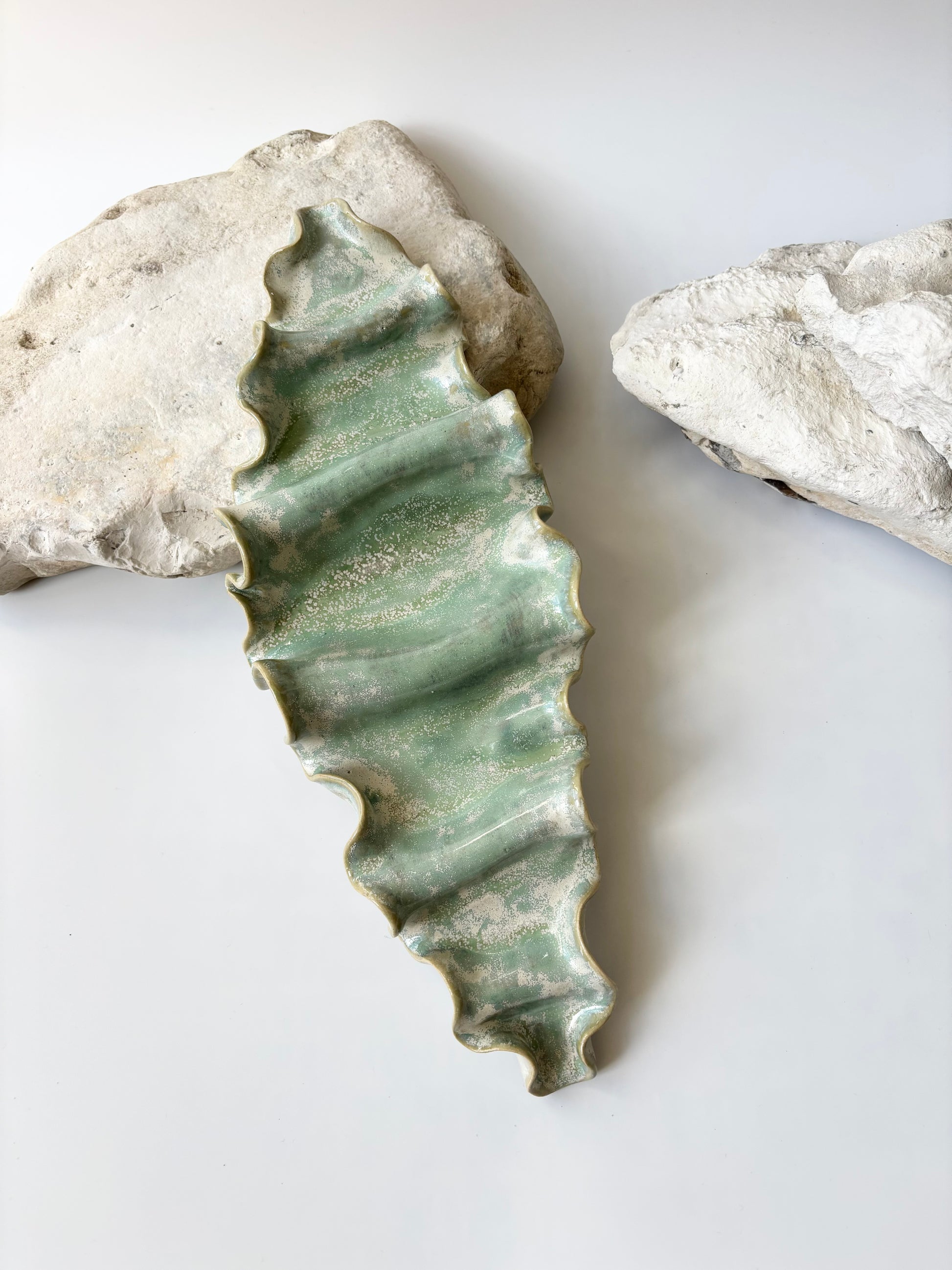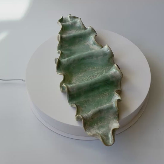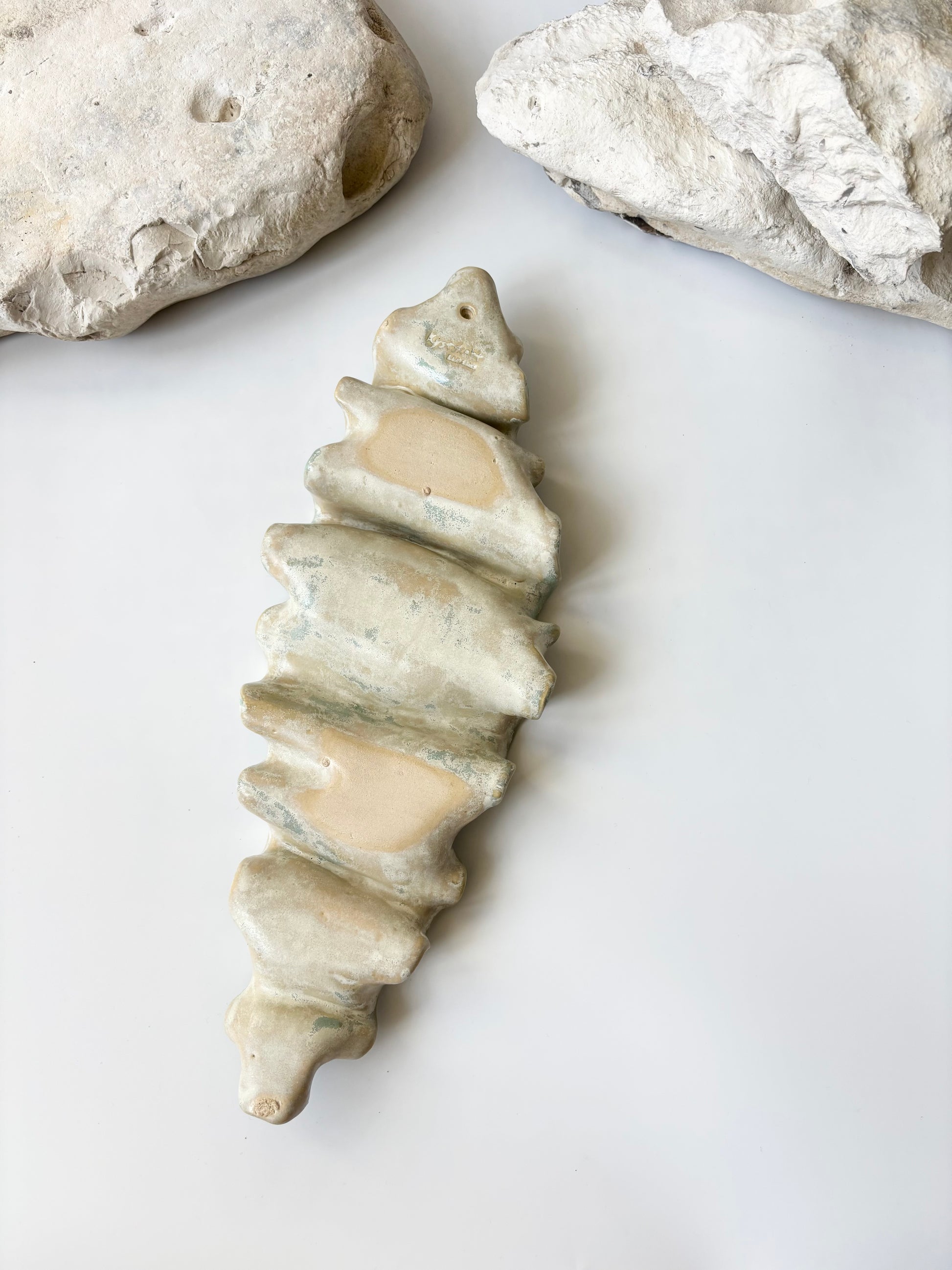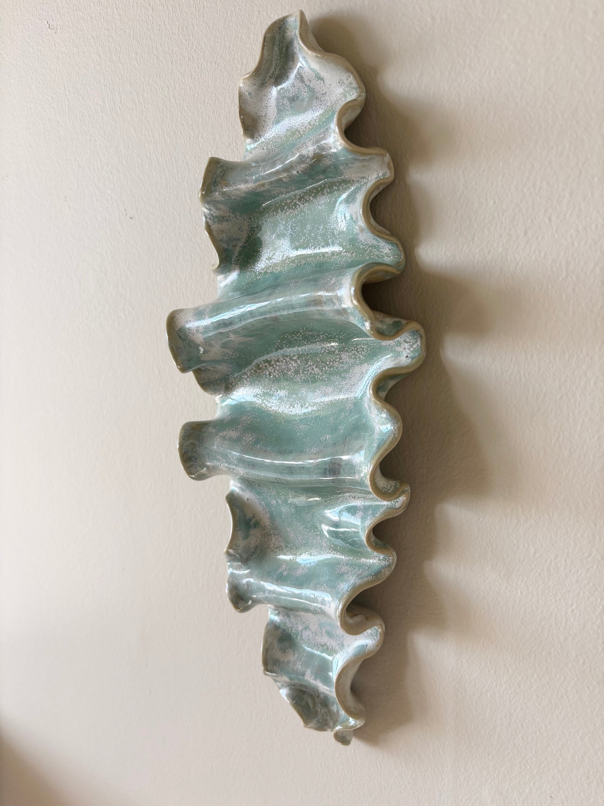 Beskrivelse: Elegant vægophæng med et bølgende og rytmisk udtryk inspireret af tangplantens svajende dans under vandet. Glaseret med en sart grøn glasur, der bryder over tekstur og over i mere beige nuancer. Der er hul på bagsiden, så skulpturen er klar til at montere på væggen.