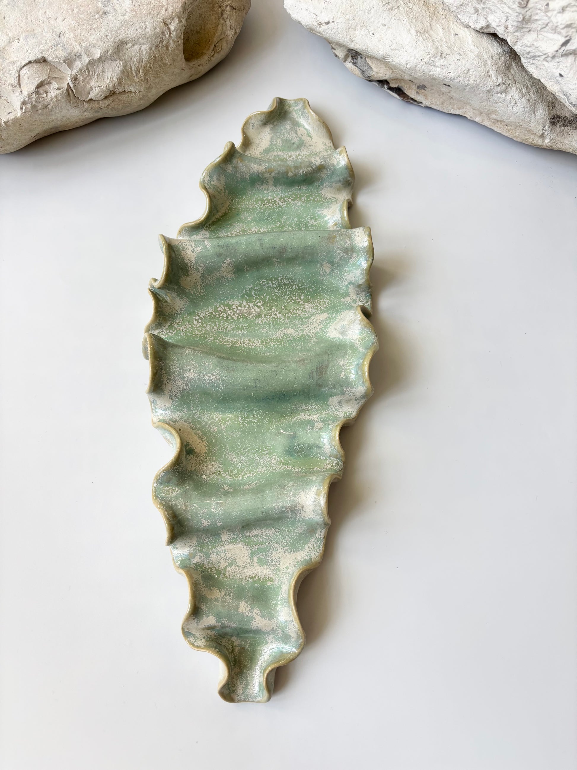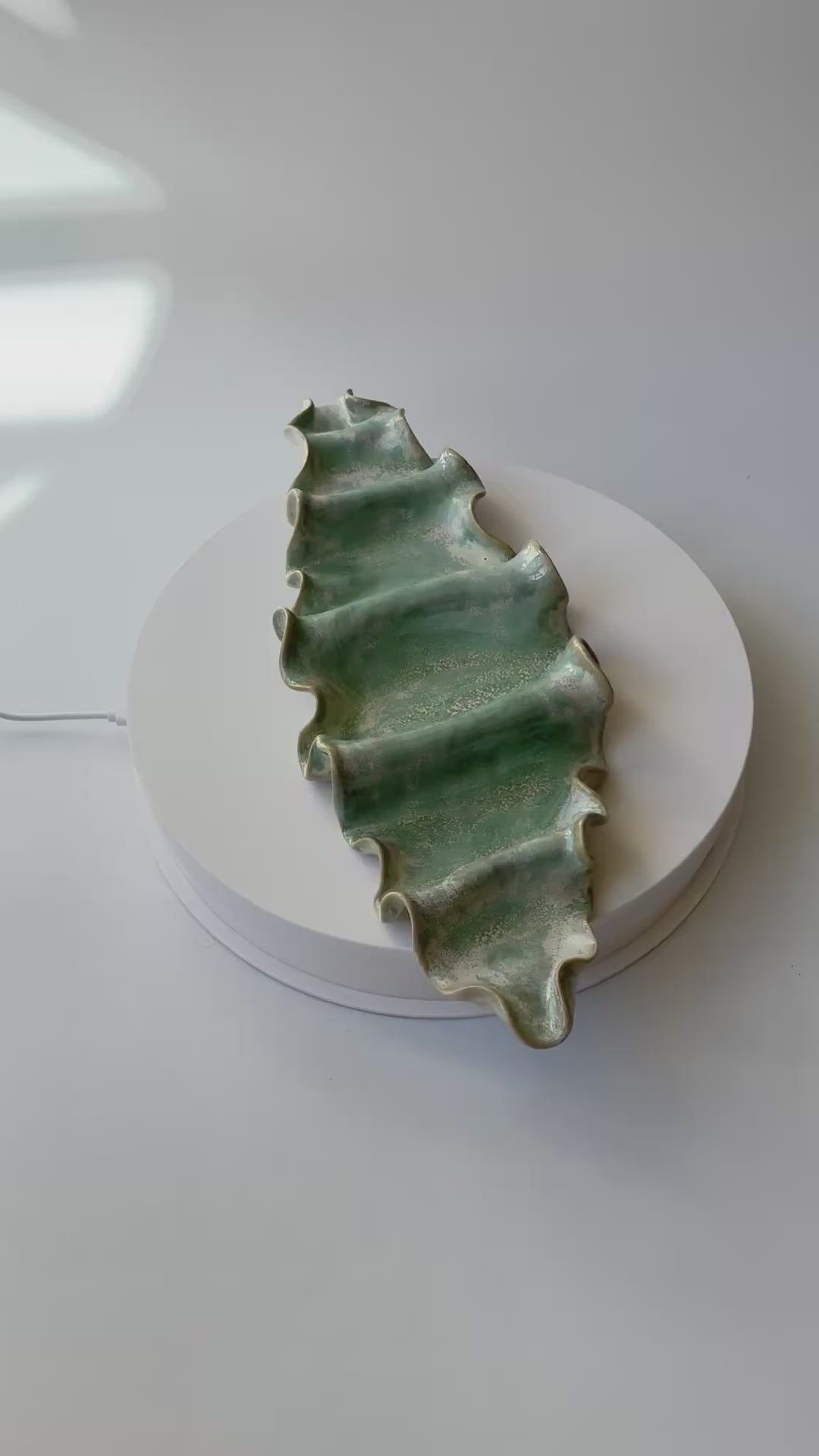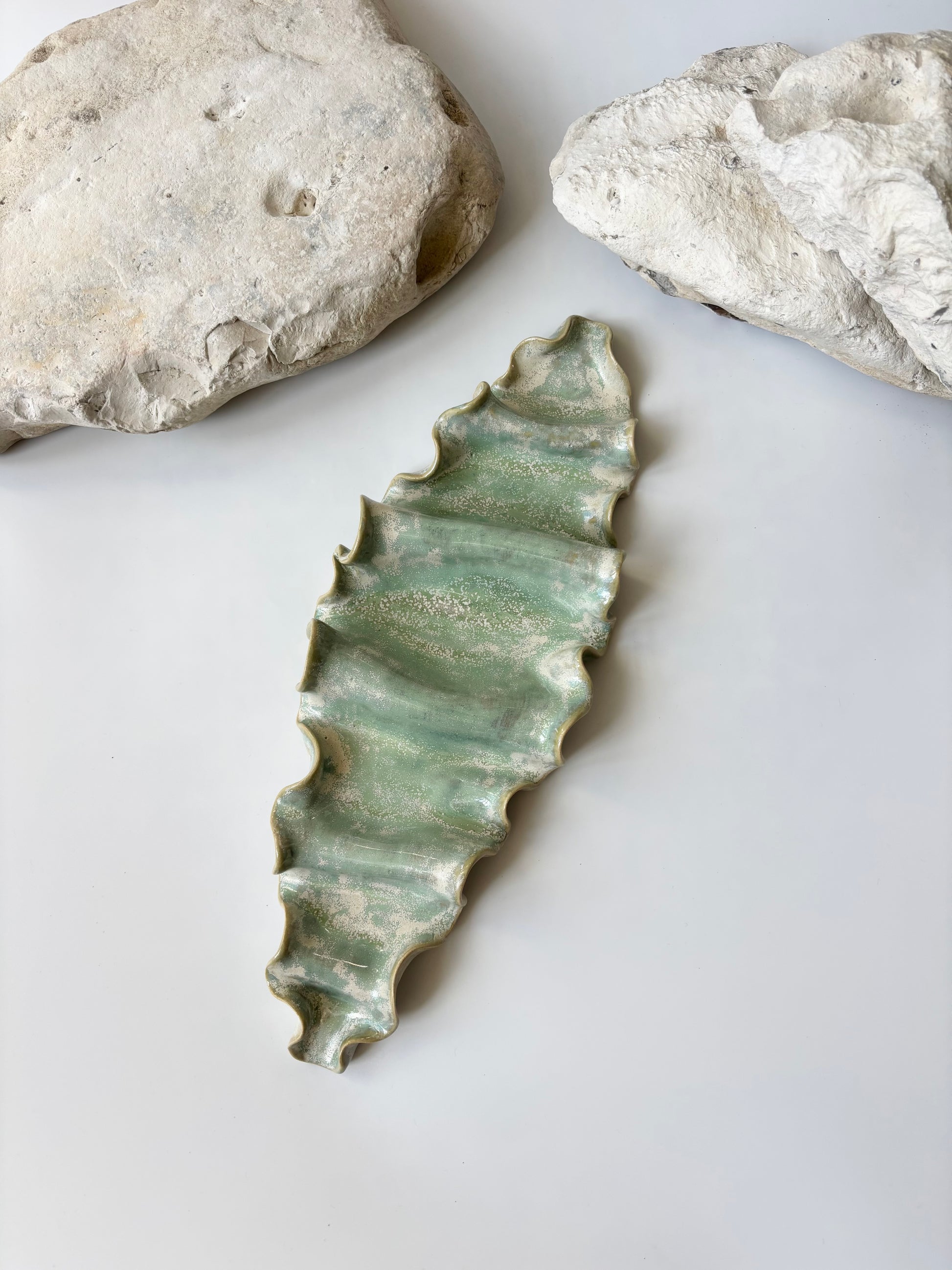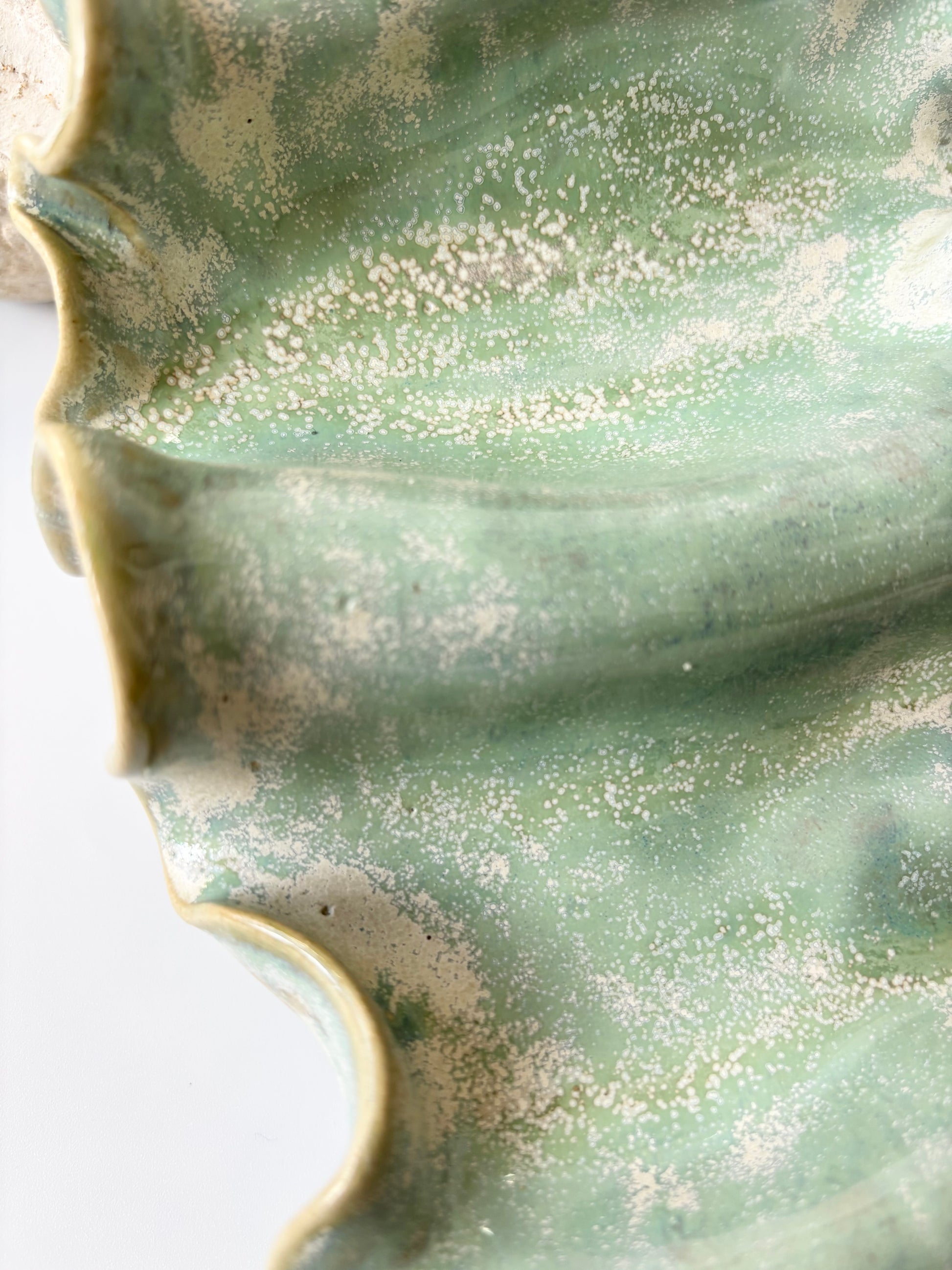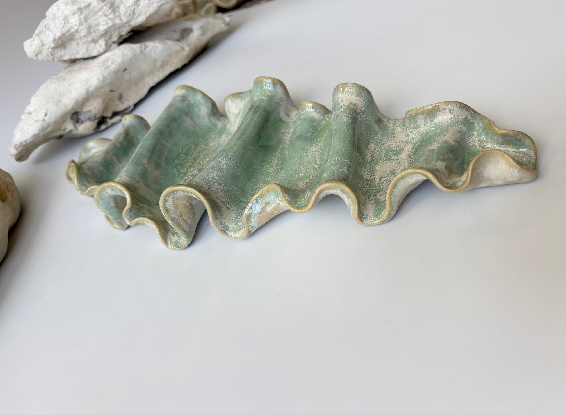 Beskrivelse: Elegant vægophæng med et bølgende og rytmisk udtryk inspireret af tangplantens svajende dans under vandet. Glaseret med en sart grøn glasur, der bryder over tekstur og over i mere beige nuancer. Der er hul på bagsiden, så skulpturen er klar til at montere på væggen.